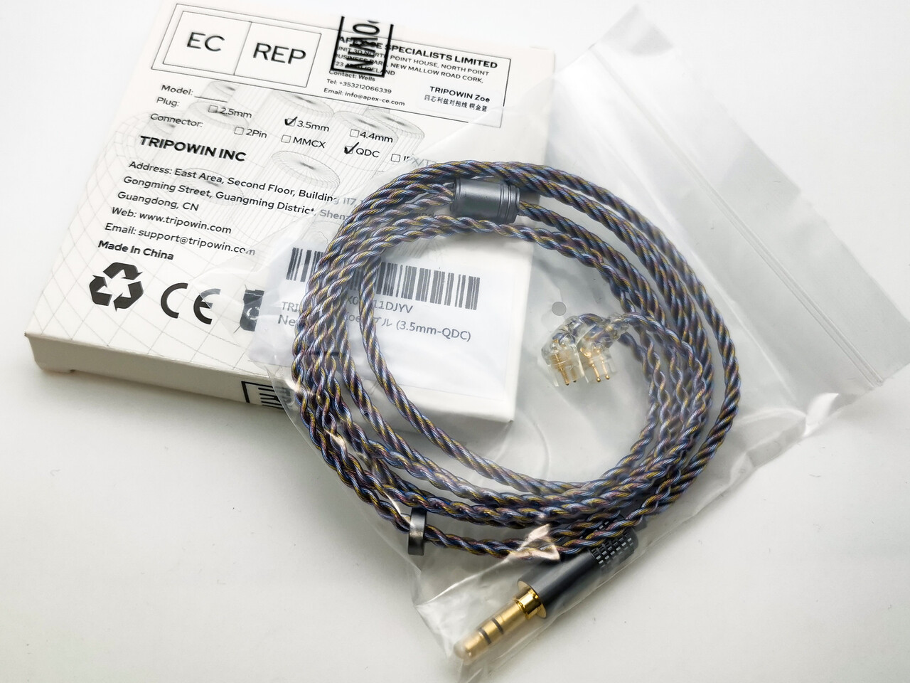 「Tripowin Zoe」は、4芯の純銅線+銀メッキ銅線+銀メッキ銅金メッキ線の3種類の線材のミックスケーブルで、より自然で高いサウンドパフォーマンスを実現しています。またシールド付きのリッツ構造を採用し、歪みを抑えながら外部信号と内部信号からの干渉を減らすことができます。線材は柔らかく細く、明るい色の線材により組み合わせるイヤホンを鮮やかに彩ります。