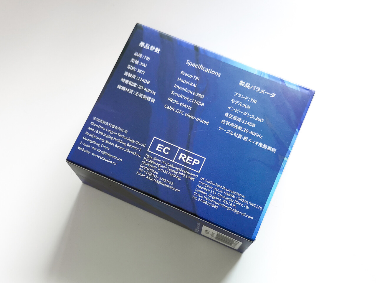 「TRI x HBB KAI」のパッケージは同梱されるレザーケースにぴったりのサイズの非常にコンパクトなもの。やたら過剰包装ぎみのケースが多い中華イヤホンですが、この製品ではエコを意識して、とのことです(今後も意識するかはわかりません^^;)。
