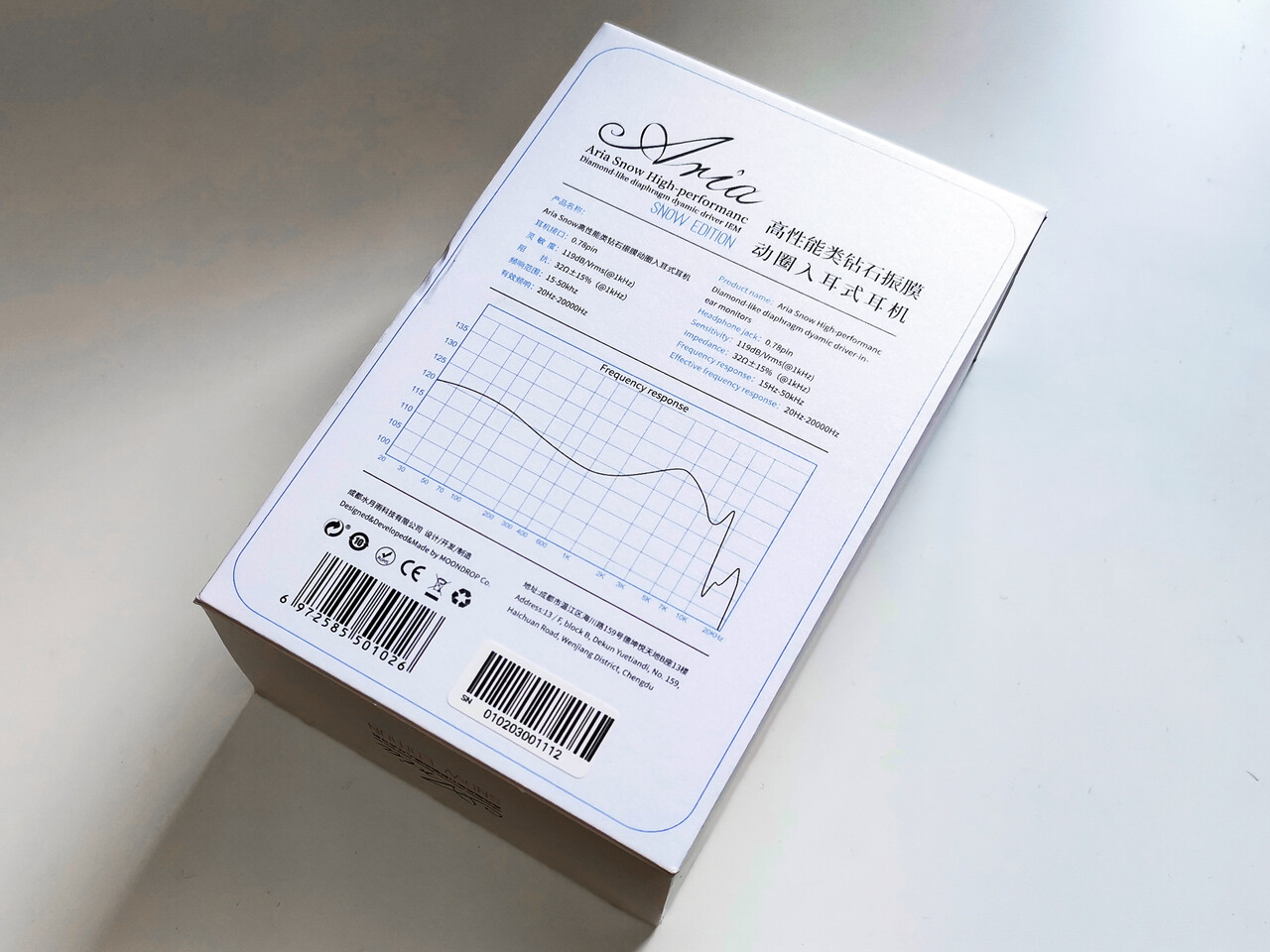 「Moondrop」といえばキャラクターのイラストが描かれたパッケージがお馴染みですが、今回はさらに雰囲気のあるパッケージデザインになっていますね。「Aria」はブラックを基調のデザインでしたがこちらは雪の雰囲気に合わせてホワイトを基調にしています。
