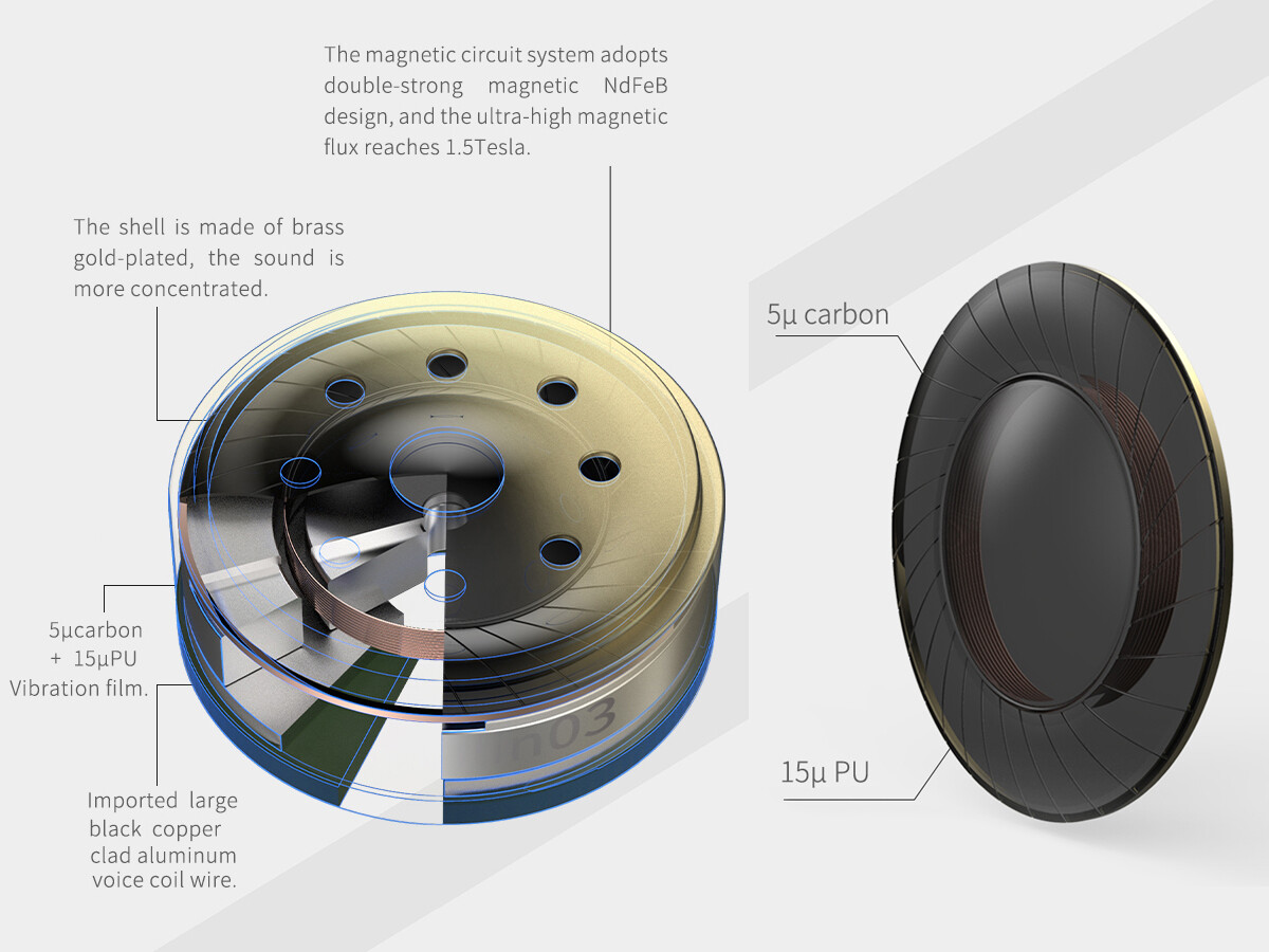 「BGVP Melody」で採用される自社開発の第3世代「12mm大型ダイナミックドライバー」は、高品質の「lilin03カーボンクリスタルポリウレタン複合振動板」(lilin03-carbon crystal polyurethane composite diaphragm)を搭載。磁気回路には1.5テスラの強力な磁束を生み出すNdFeB複歪マグネットを採用。キャビティには金メッキ真鍮素材を使用しサウンドパフォーマンスを高めています。この新しいドライバーは高品質の低音、洗練されたボーカル、詳細な演奏を備えた強力なサウンドパフォーマンスを生み出し、あらゆるジャンルの音源を引き立てます。