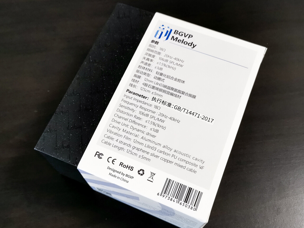 「BGVP Melody」のパッケージは黒いボックスを化粧箱で覆う構造で新しいBGVPのロゴマークがサイドでワンポイントになっていますね。大きいサイズのハードケースが付属するため、箱はちょっと大きめです。