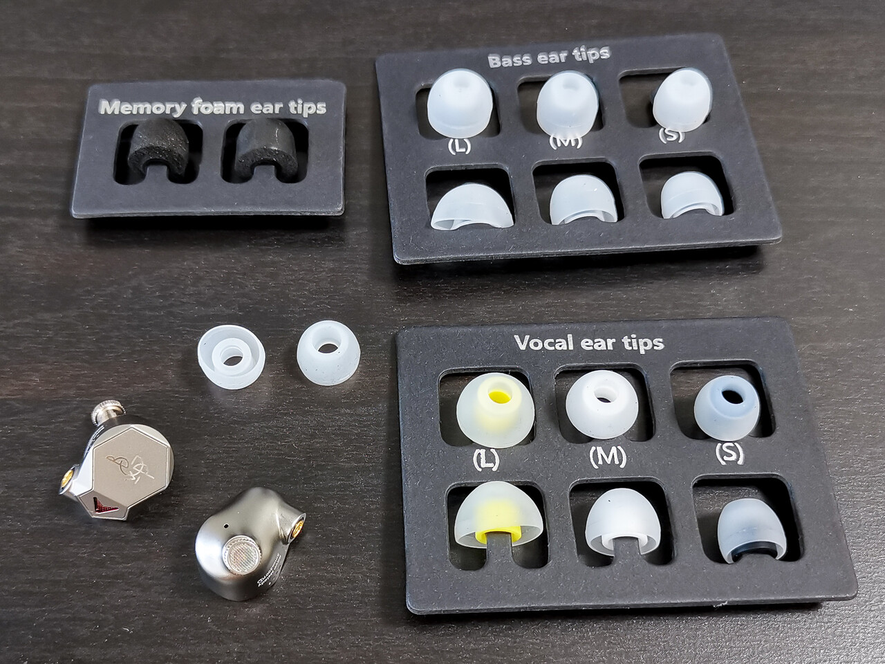付属のイヤーピースは開口部の大きい柔らかいMサイズが装着済みで、それ以外はよくある形状のシリコン(白色)といわゆつ「AET07」タイプ(開口部が大きい方)の2種類+1個。およびウレタンが1ペアという構成。通常は装着済みのMサイズかAET07タイプを使用する感じになると思いますが、必要に応じてよりフィット感のあるものに交換するのも良いでしょう。