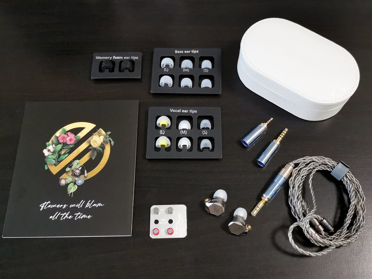 付属ケーブルは金属ワイヤー色の4芯タイプのグラフェンコート・ミックス線ケーブルが付属します。透明な被膜は適度な弾力があり取り回しは結構良い印象です。また最近増えてきましたがプラグは交換式タイプが採用されておりシングルエンド、バランスを再生環境に応じて交換できます。3種類の交換用プラグと交換フィルターノズル(と固定金具)をすべて収納しようと思うとそれなりにスペースが必要なため、「BGVP Melody」付属の大きなハードケースはとても有り難いですね。ほかの製品ではケースが小さめで付属品が全ては入らず、やむなくケースを交換しないといけないパターンも結構多いため、このようによく考えられているBGVPの構成は好感が持てます。