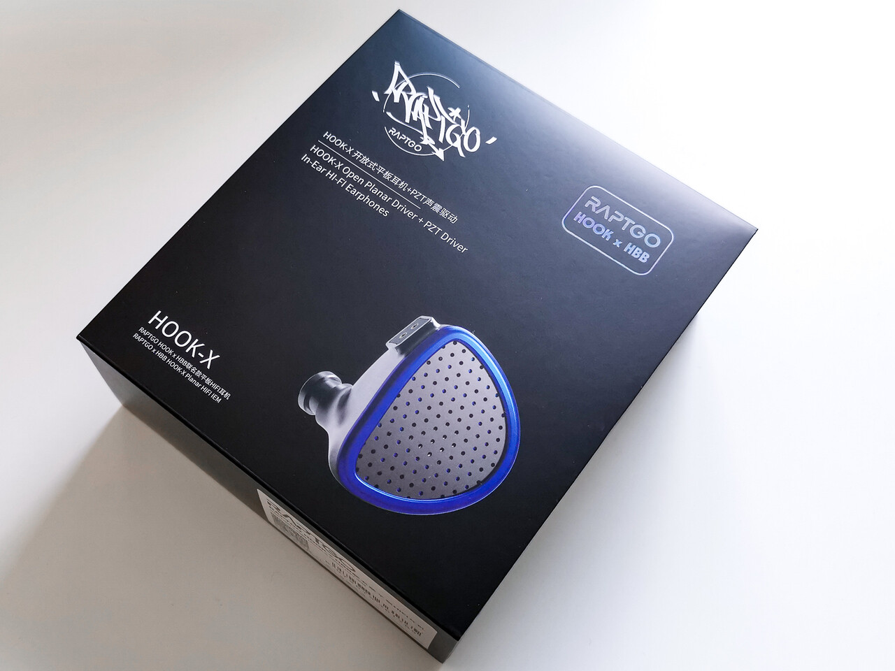 こんにちは。今回は「RAPTGO × HBB HOOK-X」です。14.2mm平面駆動ドライバーとPZT(圧電/ピエゾ)ドライバーのハイブリッド構成で人気の高い「RAPTGO HOOK-X」をベースに、ドライバーをアップグレードし、独自のチューニングを加えたHBB氏コラボモデルが登場。リム部分が曲線的なメタルブルーとなり外観もよりクールに、音質面もよりパワフルにグレードアップしました。