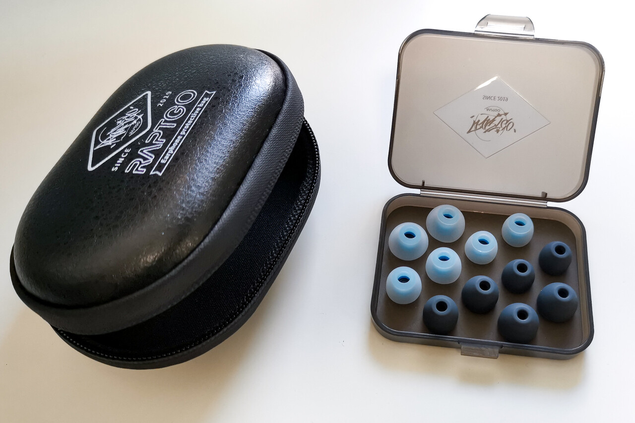 付属のレザーケースも「HOOK-X」がグレーに対して「RAPTGO × HBB HOOK-X」ではブラック。イーやーピースは「HOOK-X」と異なり、より一般的な形状のものが開口部の違いで2種類が同梱されます。付属品のほか、JVC「スパイラルドット」、acoustuneの新タイプの「AEX07」、粘着度のあるタイプでは「SpinFit CP100+」など、定番イヤーピースに交換するのも良いでしょう。