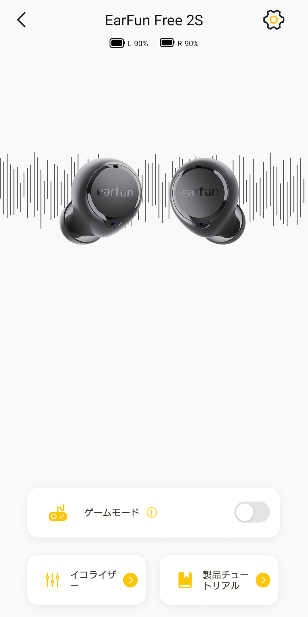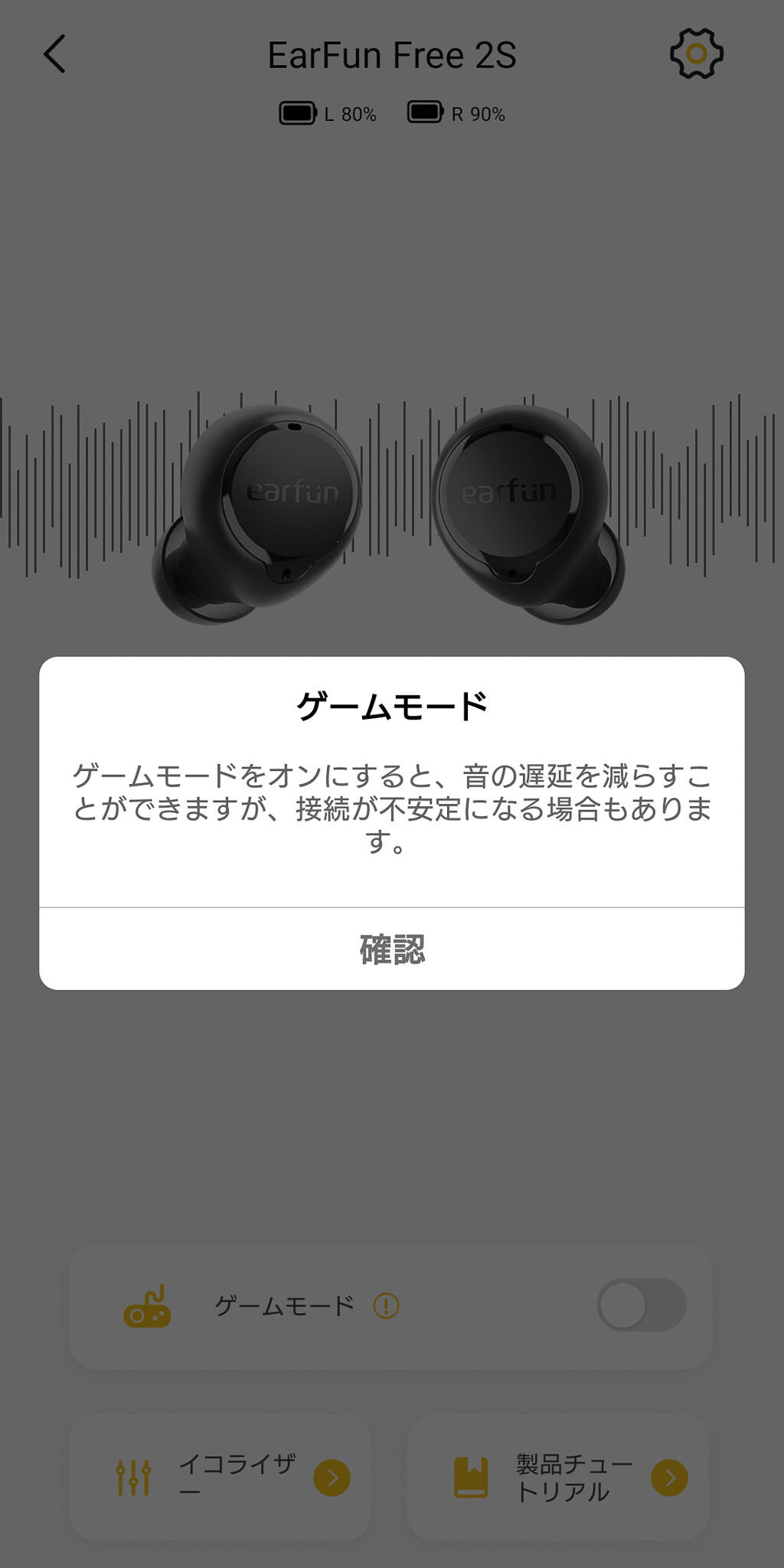 アプリのメニューではゲームモードのON/OFFやEQ(イコライザー)の設定などが分かりやすく変更できます。EQ(イコライザー)は3段階のみの非常にシンプルなものですが、複雑なチューニングを気にすること無く変更できるので多くのユーザーにとってはむしろ使いやすいのではと思います。