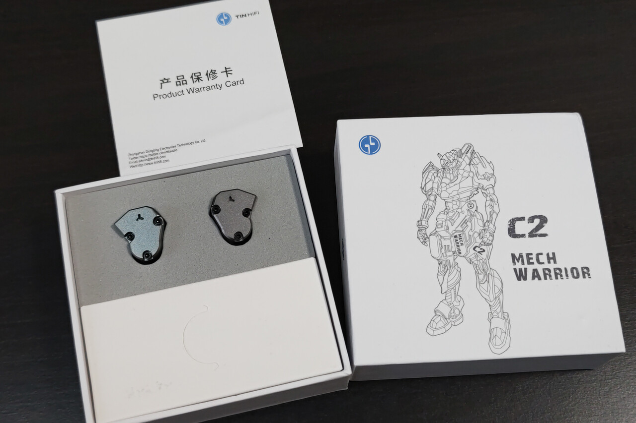 本体のメカメカしいデザインから「Mech Warrior」という愛称が付けられた「TINHIFI C2」ですが、この名称に合わせてロボットがデザインされパッケージに描かれています。まあ最近中華イヤホンでとにかく増えた「キャラ絵」のパッケージに対して、「まあキャラ萌えがあればメカ萌えがあってもええよね」というのが伝わってきそう。今後このアプローチも流行るかな?(笑)。