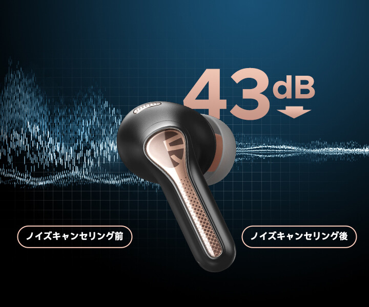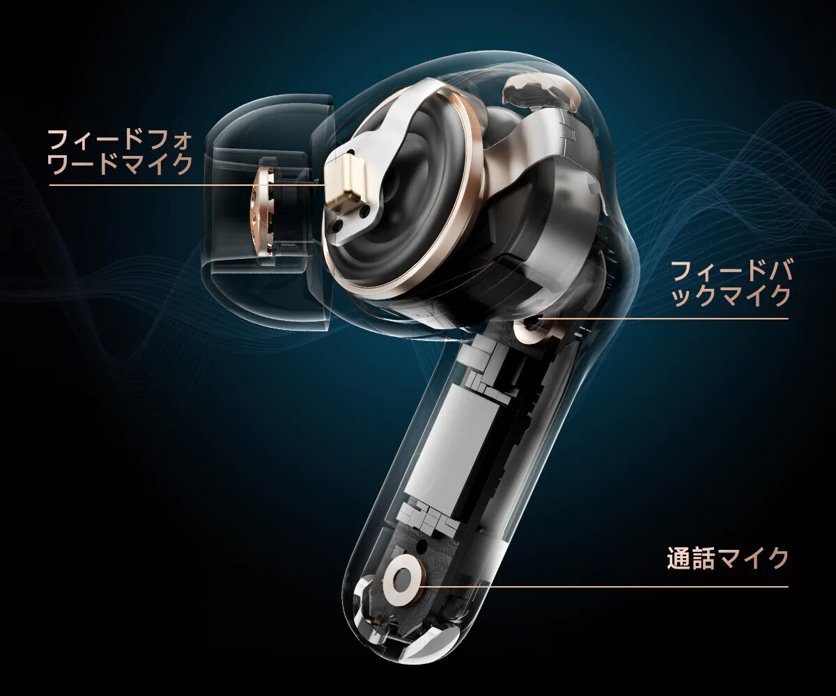 さらに「SOUNDPEATS Capsule3 Pro」では最大「-43dB」の強力なアクティブノイズキャンセリング(ANC)機能を搭載。フィードマイクで集音した外部ノイズを逆位相で相殺し、さらにフィードバックマイクで集音した残留ノイズを最終的に打ち消すことで、効率よく優れたノイキャン性能を発揮できます。