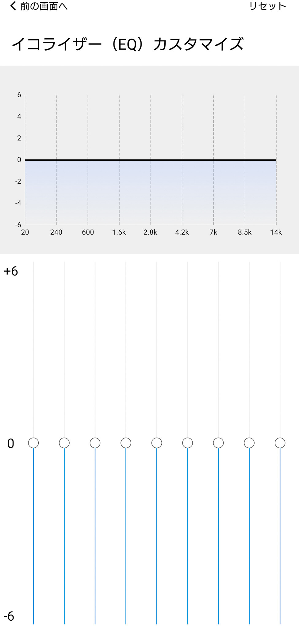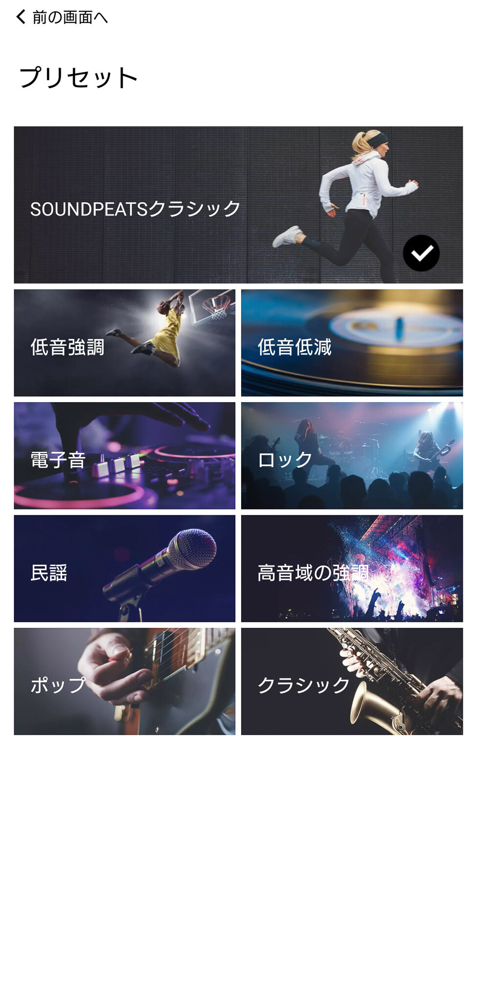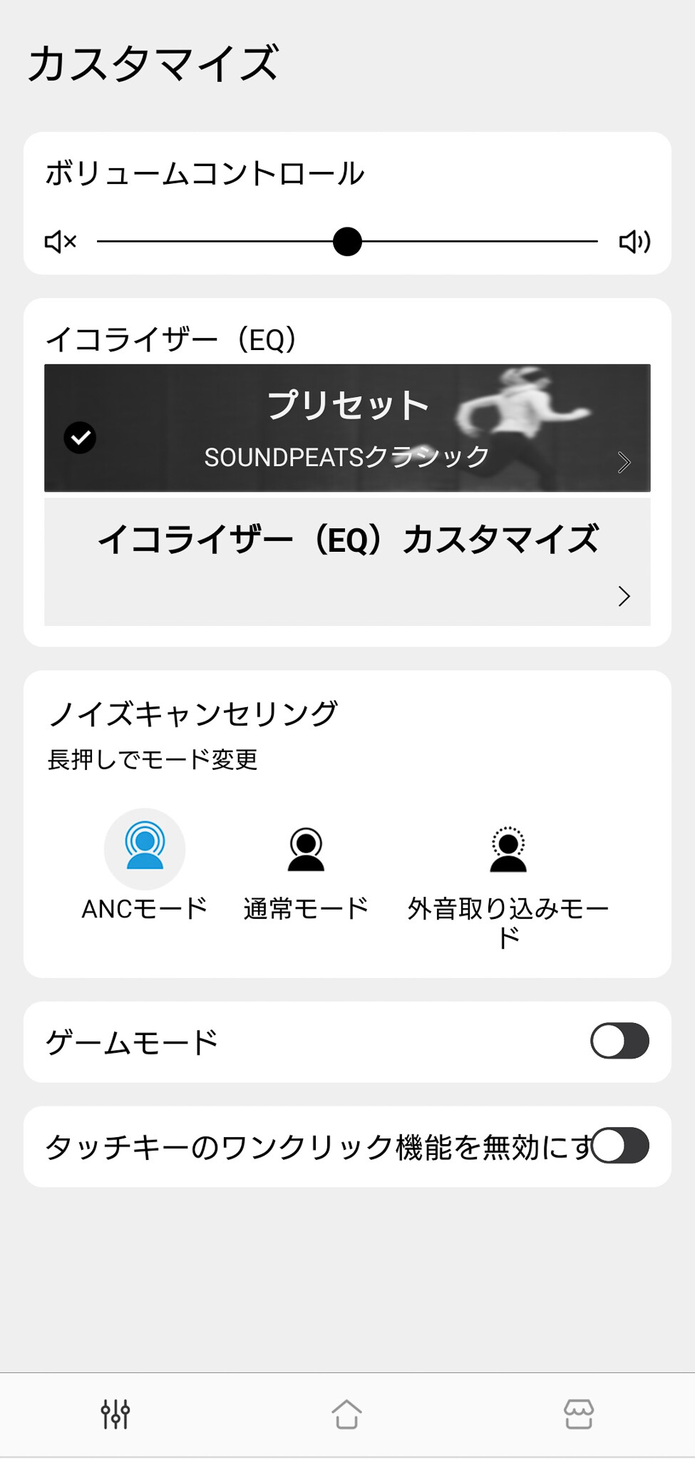 「カスタマイズ」画面では音量調整、各種EQ設定、ノイズキャンセリングで「ANC」モードの設定、ゲームモードのON/OFF等が可能です。音量やゲームモードは本体のタッチセンサーでも変更できますが、画面だと分かりやすいですね。イコライザー(EQ)については標準では「SOUNDPEATSクラシック」という状態になっています。ここで「ロック」などのジャンルや「高音強調」や「低域軽減」など8種類(クラシックも含めれば9種類)のプリセットモードが選択できます。このプリセットは結構実用的で、多くの場合はこのモードを選択するだけで十分に満足のいくサウンドを楽しめそうです。もちろん自分でEQをゴリゴリ設定したい方は「イコライザー(EQ)カスタマイズ」で個別のチューニングも可能です。