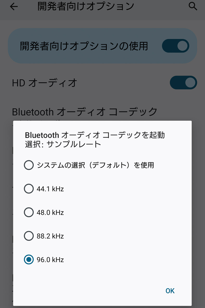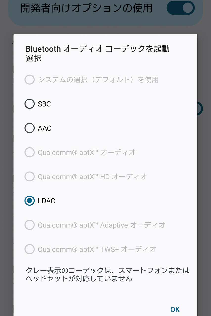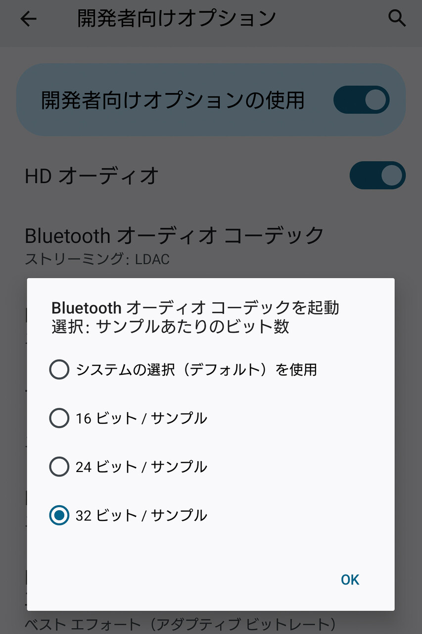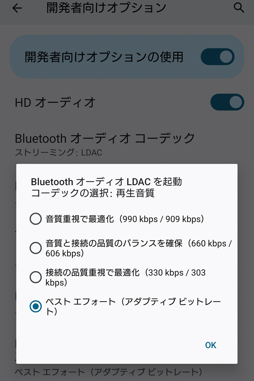 「LDAC」コーデックは「aptX」や「aptX Adaptive」などのコーデックよりビットレートが高いこともあり、「音質優先」(高ビットレートのモード)では街中など混雑した場所では多少途切れやすくなることもあるようです。屋外での利用は「再生品質」は「自動」が推奨です。また都心の通勤通学時間帯などさらに電波状況が悪く「自動」でもビットレートの変更が追いつかない場合もやはりあります。その場合は、「開発者向けオプンション」で「接続品質重視」の設定にしり、「ビット数」が「32bit」の場合は「24bit」にしたほうが安定して接続できる場合が多いようです。