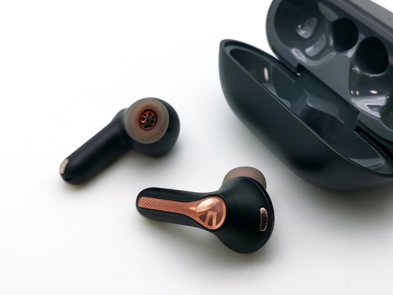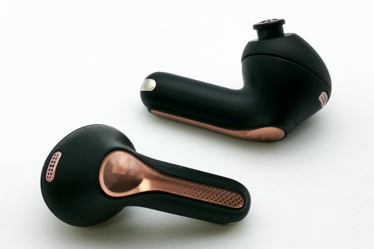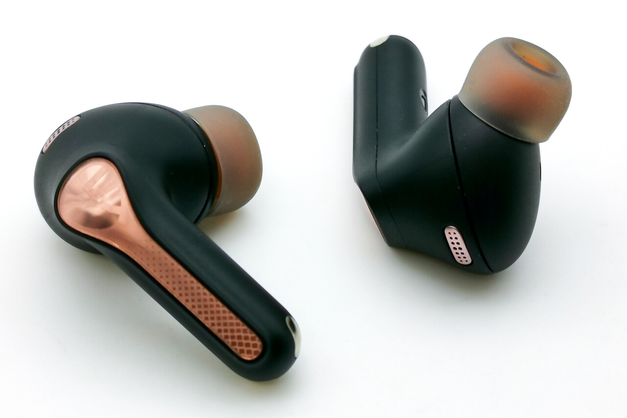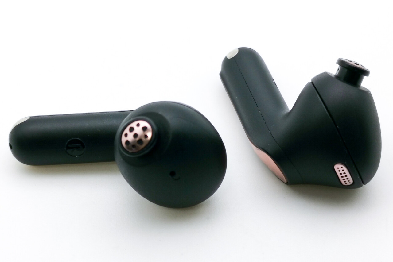 本体はいわゆるAirPods Pro型のデザインで、耳への収まりも良く使い勝手の良いデザインです。インイヤー型より遮音性が高くしっかり装着出来ますね。