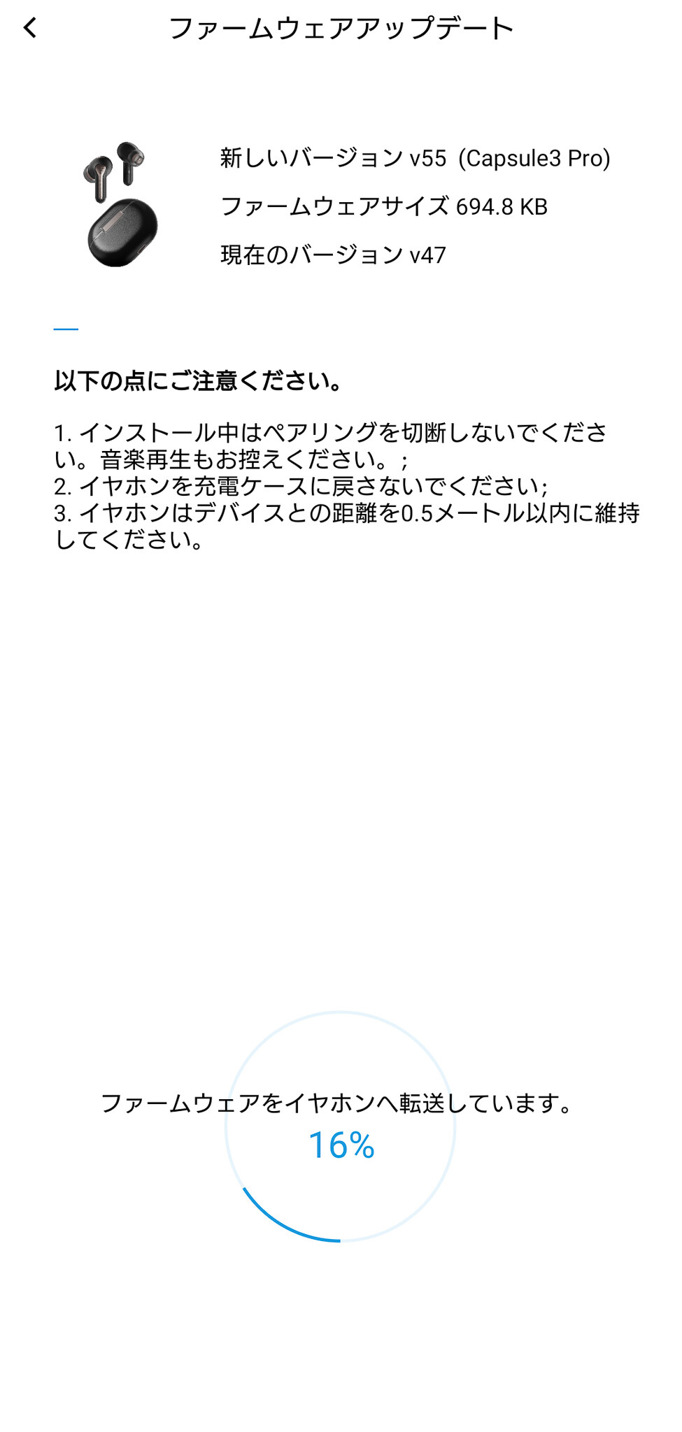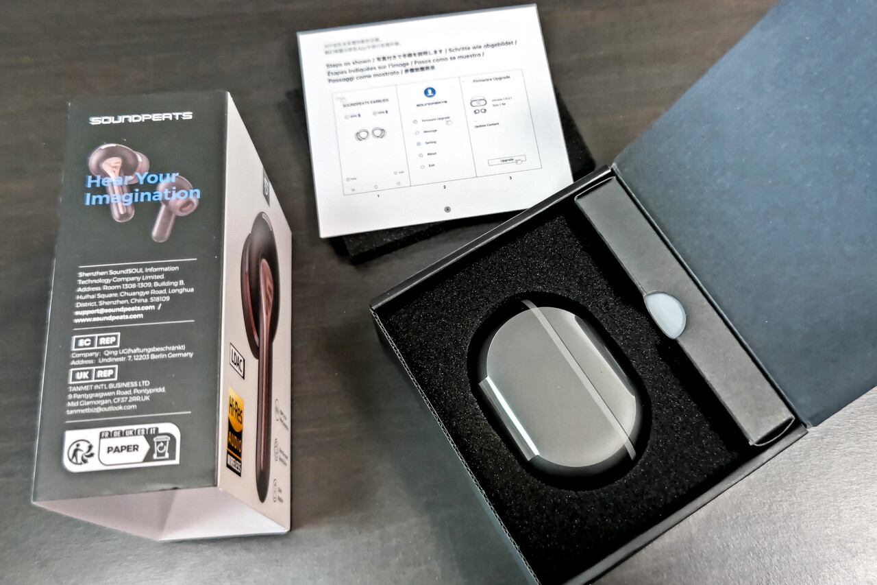 サンプリングレートは「LDAC」の規格通り96kHz、そしてビットレートについては私の環境ではより高い「32bit」でペアリングしていました。仕様としては24bitと記載されていましたが、ファームウェアを更新したためか、実際には32bitまでの接続ができたようです。なお、ファームウェアはペアリング後に「SOUNDPEATS」アプリを起動すると自動でチェックを行い、新しいバージョンが存在する場合は更新を促されます。ここでバージョンアップを実施すれば数分程度でアップデートが完了します。