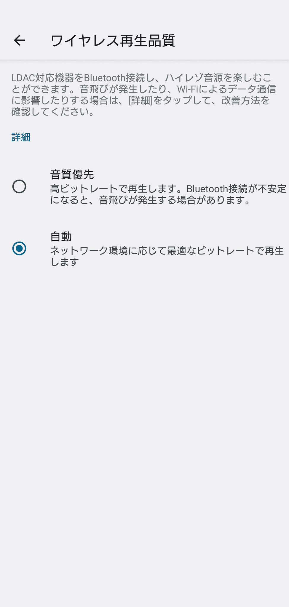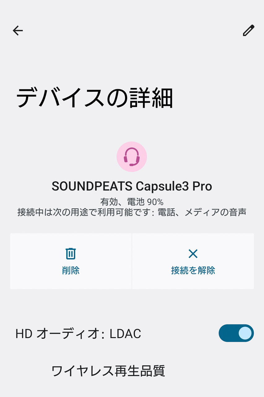 また「LDAC」コーデックでペアリングすると音声品質の設定が可能になります。一般的には「音質優先」または「自動」が選べます。「自動」では通信状態に合わせて最適なビットレートが選択されるため通常はこちらで問題ないでしょう。