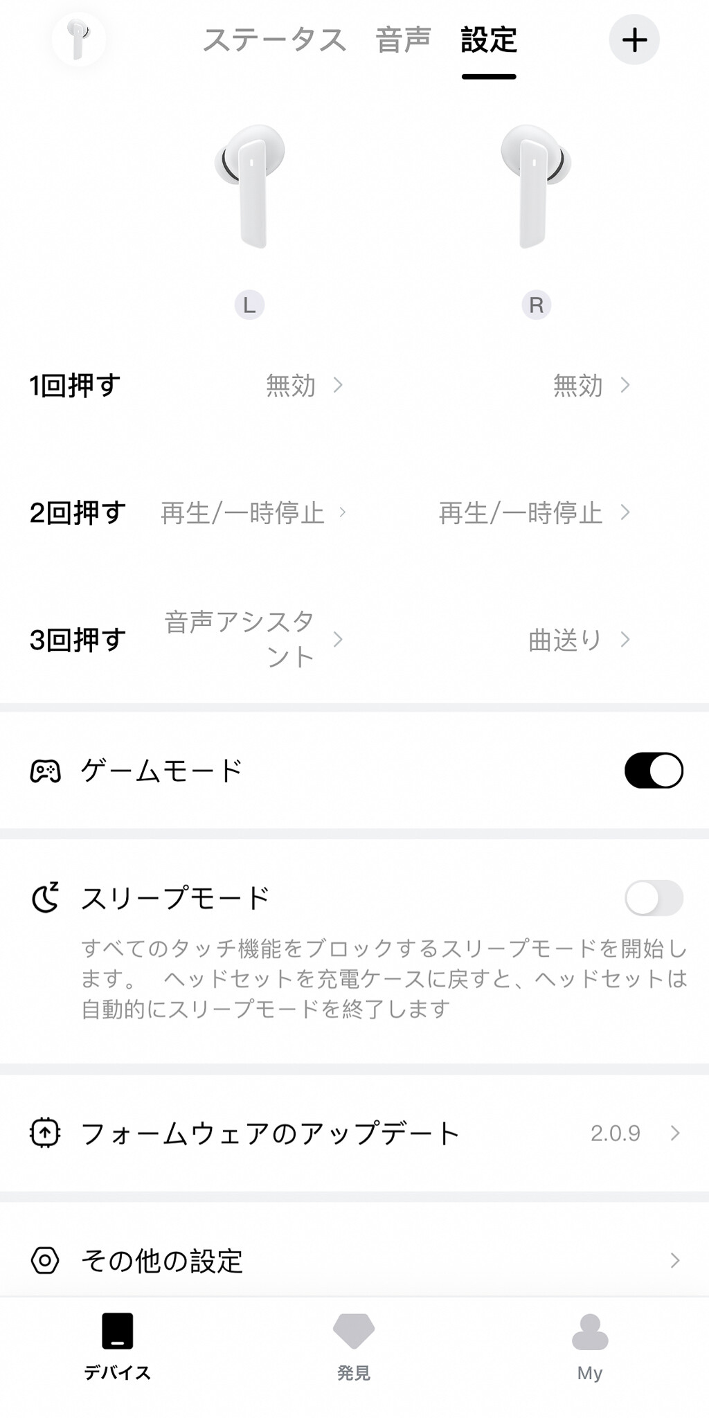 タッチセンサーの反応は一般的で、再生/停止は2回タッチするタイプ。ANCは右側長押しで切替える方式で他社とはちょっと違うかもしれませんが、アプリでアサインを変更可能です。もちろん低遅延のゲームモードにも対応します。