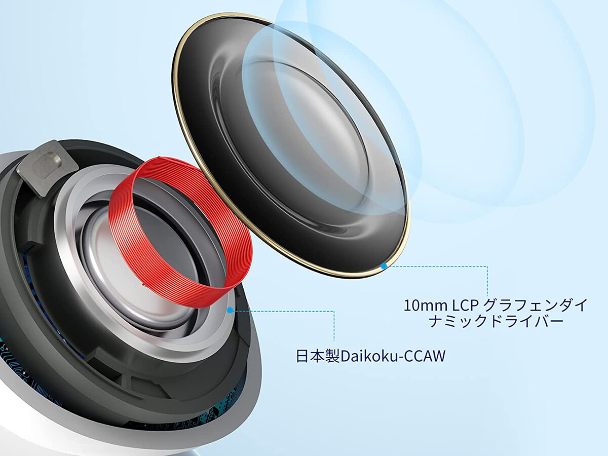 「QCY HT05 Melobuds ANC」はドライバーに10mmサイズのLCP(液晶ポリマー)グラフェンコート振動版ダイナミックドライバーを搭載。日本のDAIKOKU(大黒電線)のCCAWボイスコイルの採用など高音質ユニットを採用しています。