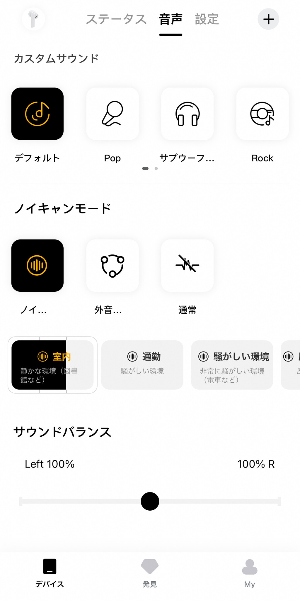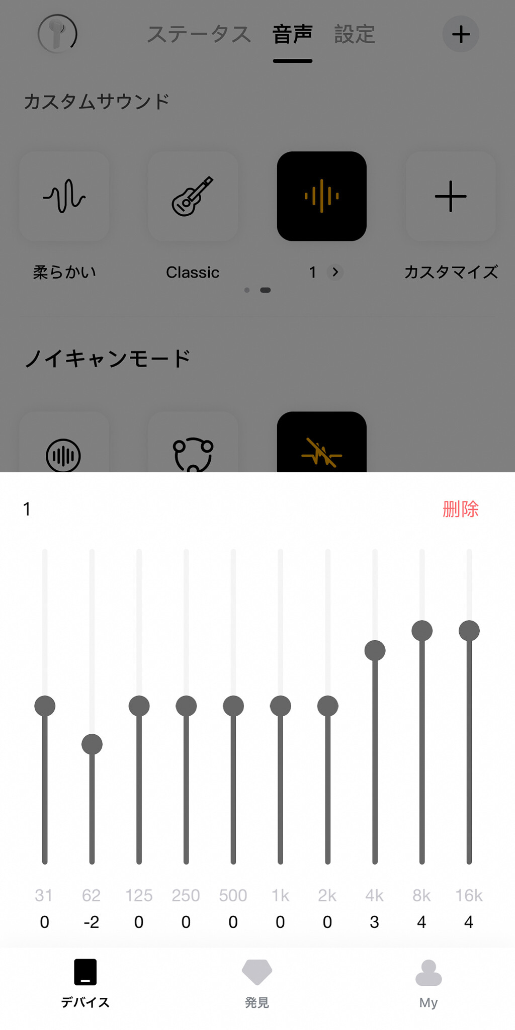 カスタムサウンドのモードは6種類のプリセットと「EQ設定」によるカスタマイズが可能。「EQ設定」の各バーは他社のアプリより微調整が可能で感覚に応じたチューニングが出来ます。