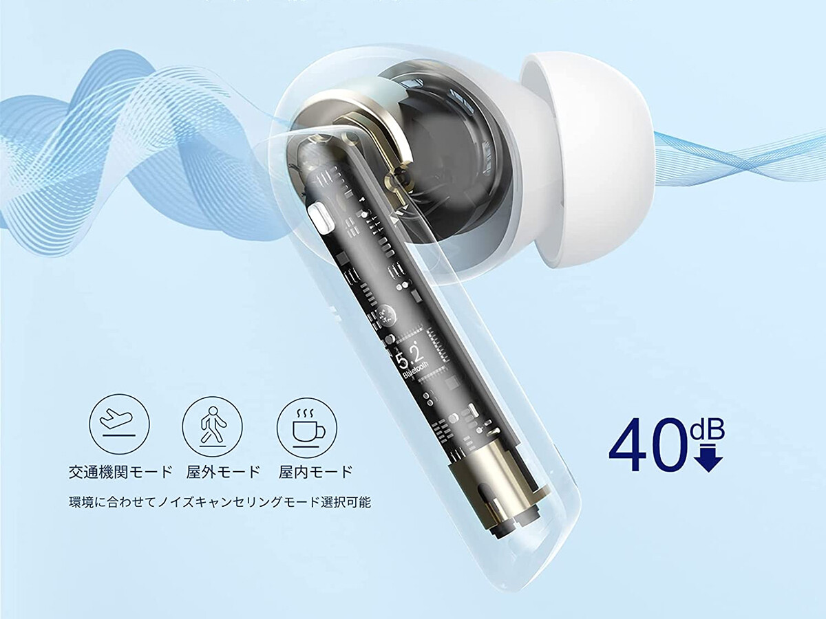 「QCY HT05 Melobuds ANC」はBluetooth 5.2対応により安定した接続性を実現。さらに本体は通話用マイクのほかフィードフォワードマイク、フィードマイクと左右で6基のマイクを搭載。フィードフォワードマイクで集音した外部ノイズを逆位相で相殺し、さらにフィードマイクで集音した残留ノイズを最終的に打ち消すことで最大-40dBの強力なアクティブノイズキャンセリング(ANC)機能を実現しています。また通話ノイズキャンセリング(ENC)機能は、独特な風切り音防止設計を採用し、風速45km/s相当の場合でもクリアな通話品質を維持できます。