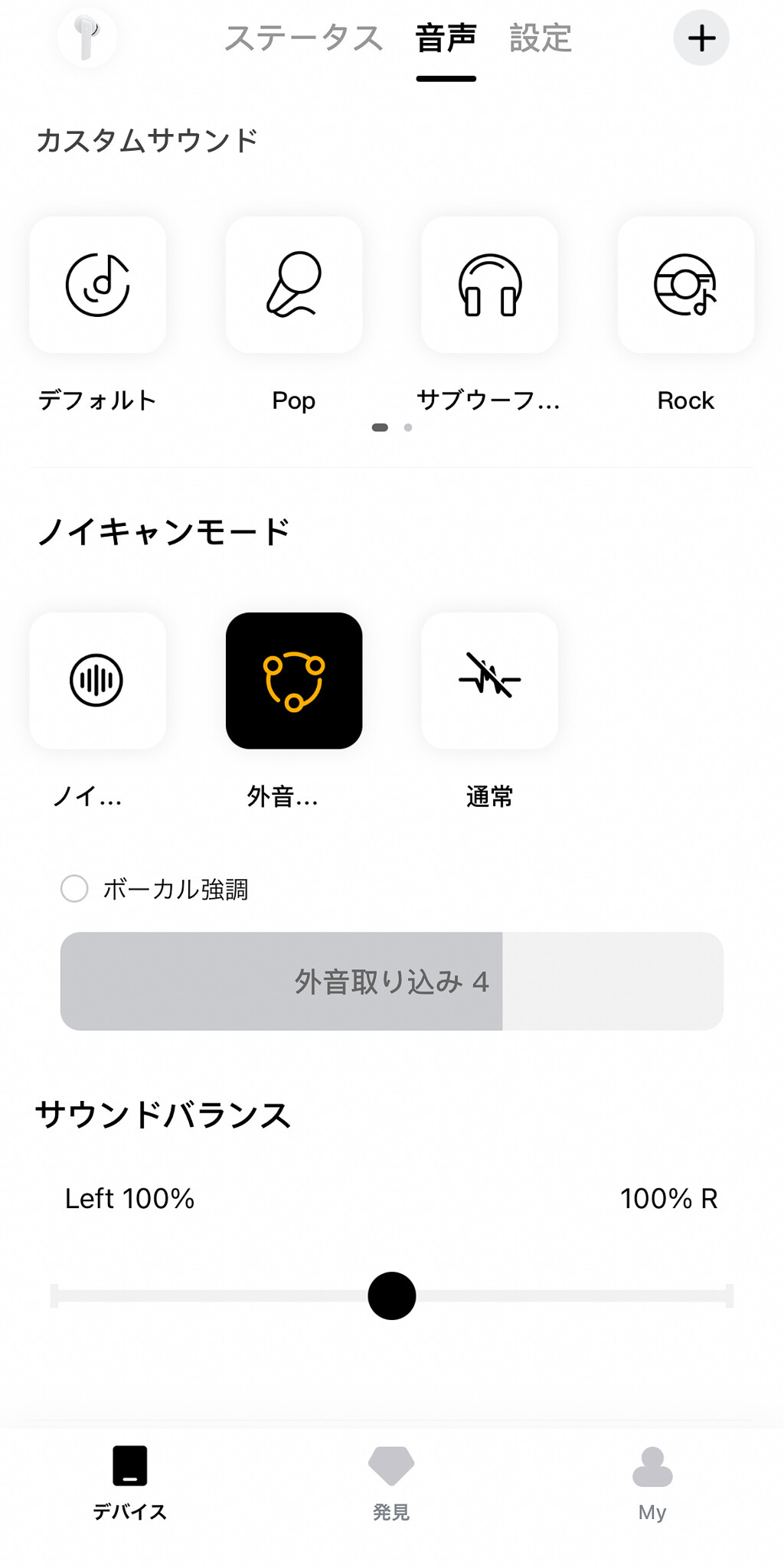 ANC機能は「ON」「外音取込み」「OFF」の各設定で、「ON」では「室内」「通勤」「騒がしい環境」「風切り音カット」の4種類のモードが選択でき、それぞれのモードで3段階の強弱を設定できます。また「外音取込み」モードでは取込み音量の調整が可能で、特に声を聴きやすくする「ボーカル強調」も選べます。この価格帯のANC機能としては他社と比較しても相当にきめ細かい設定が出来る印象ですね。