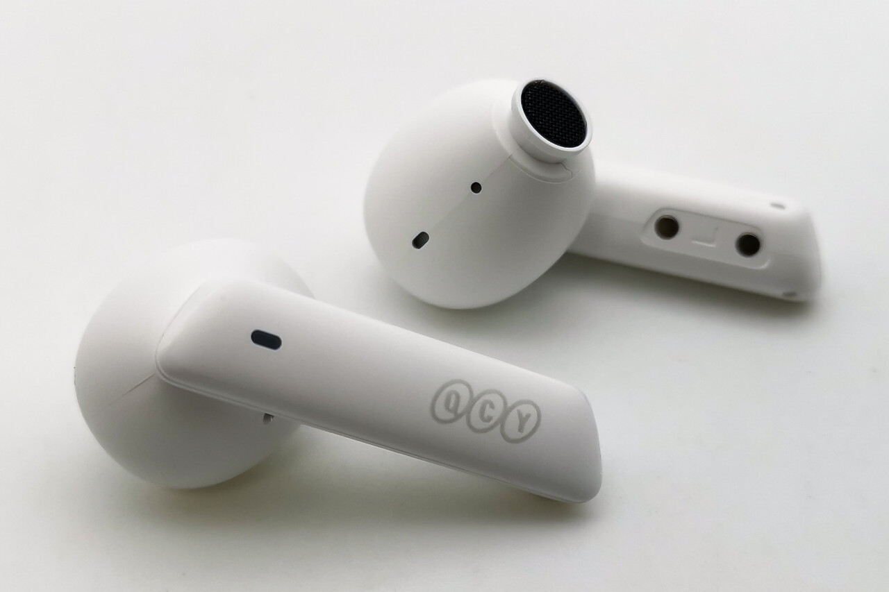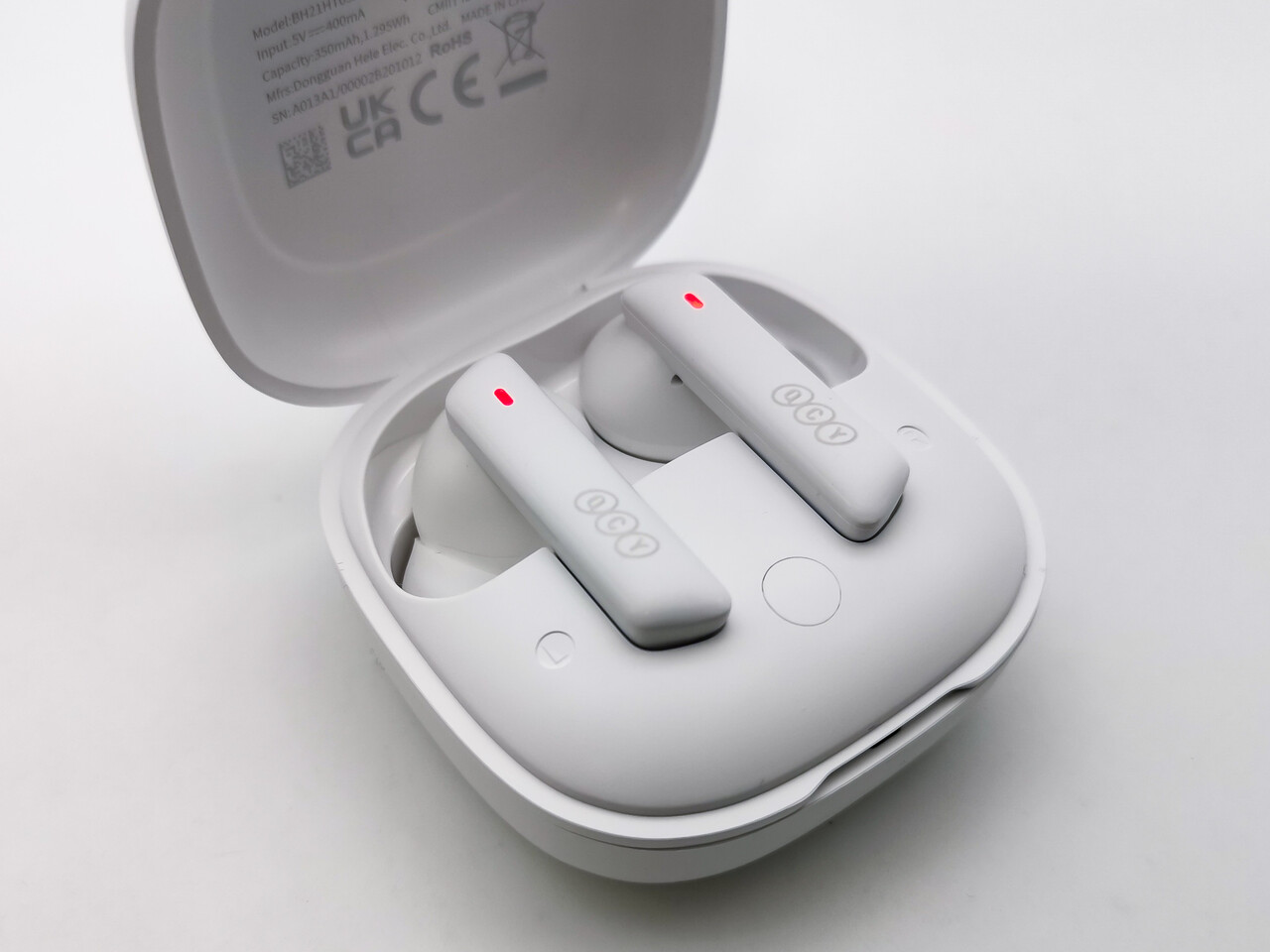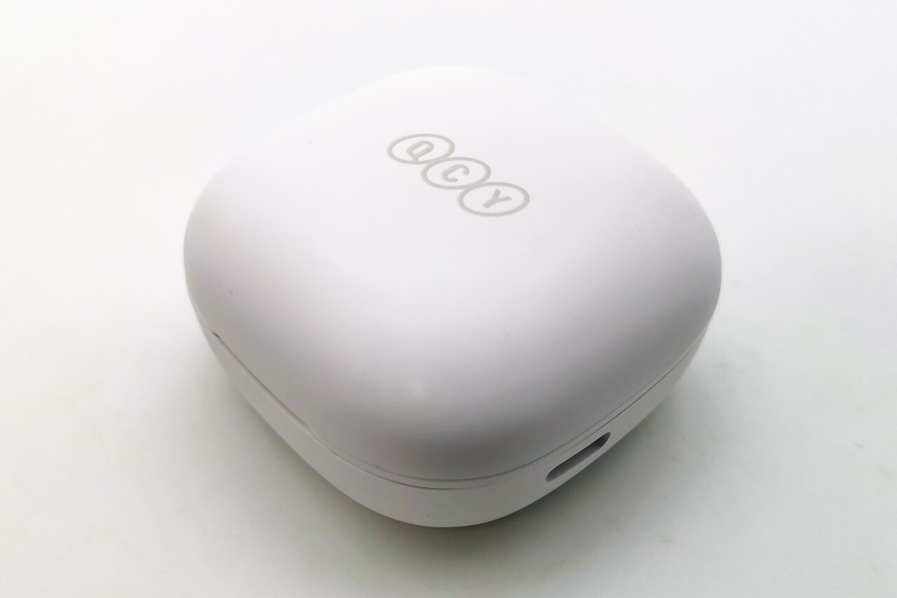ケースもシンプルなデザイン。シンプルですがAirPods Proのようなケースより取り出しやすく、使い勝手のうえも個人的にはこのタイプのほうが好きですね。QCYのロゴは本体のケースに薄いカラープリントのみで非常に慎ましいですね。OEMが多い同社らしい無印感のある外観です。