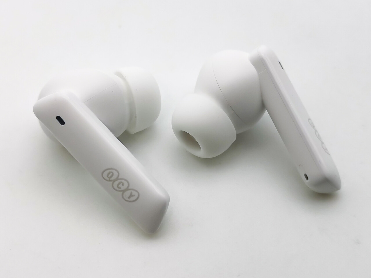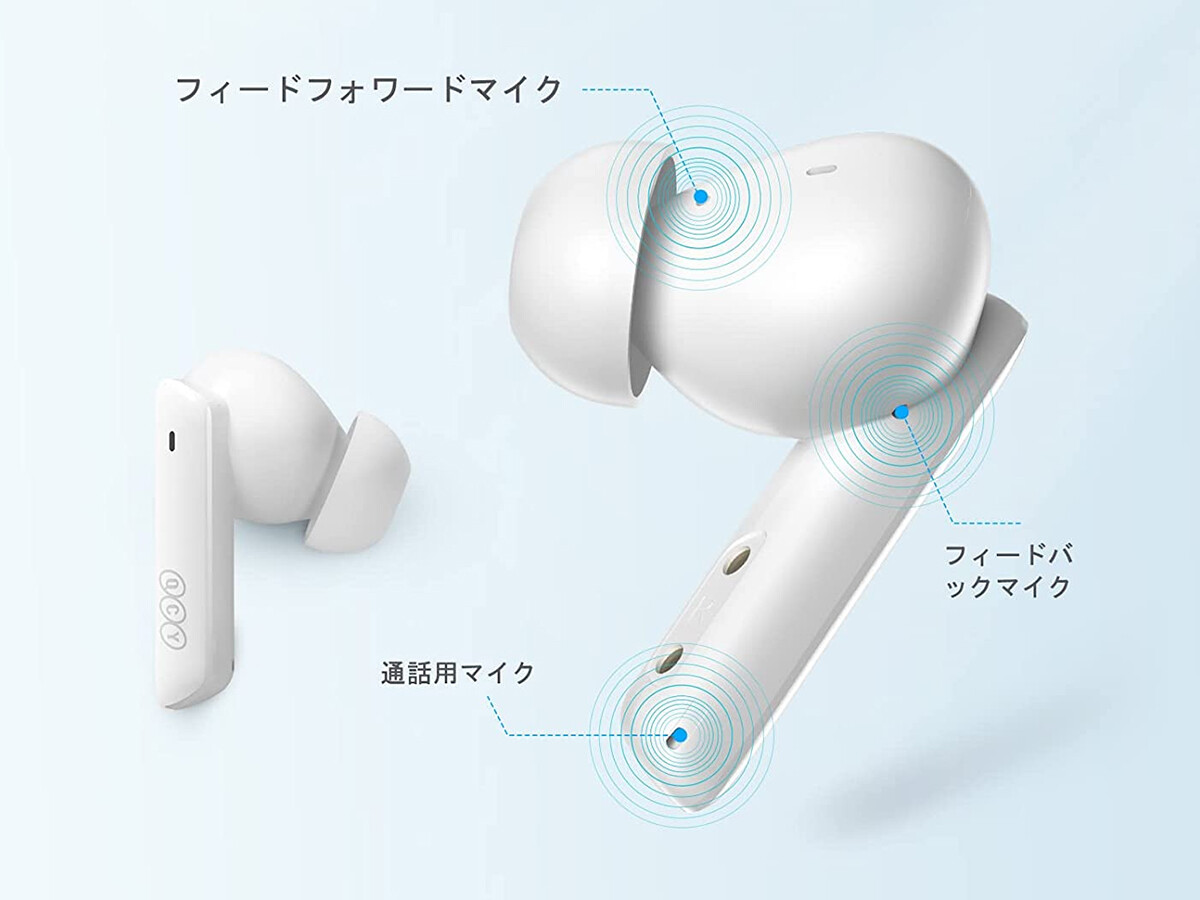 QCYのTWS製品は通話品質の良さで定評がありますが、「QCY HT05 Melobuds ANC」はANCに対応したモデルのためさらに2種類のマイクが本体上部に追加され、左右で6基のマイクを搭載します。