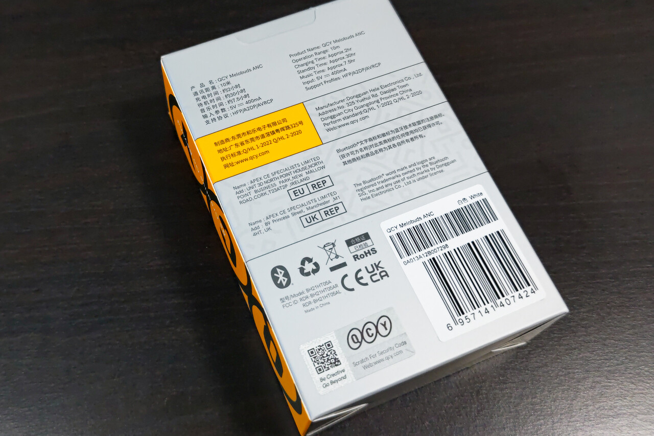 「QCY HT05 Melobuds ANC」のパッケージは製品写真を載せたいつものパッケージデザインです。パッケージ内容はイヤホン本体および充電ケース、イヤーピース(本体にMサイズ装着済み、S/Lサイズ同梱)充電用ケーブル、説明書です。