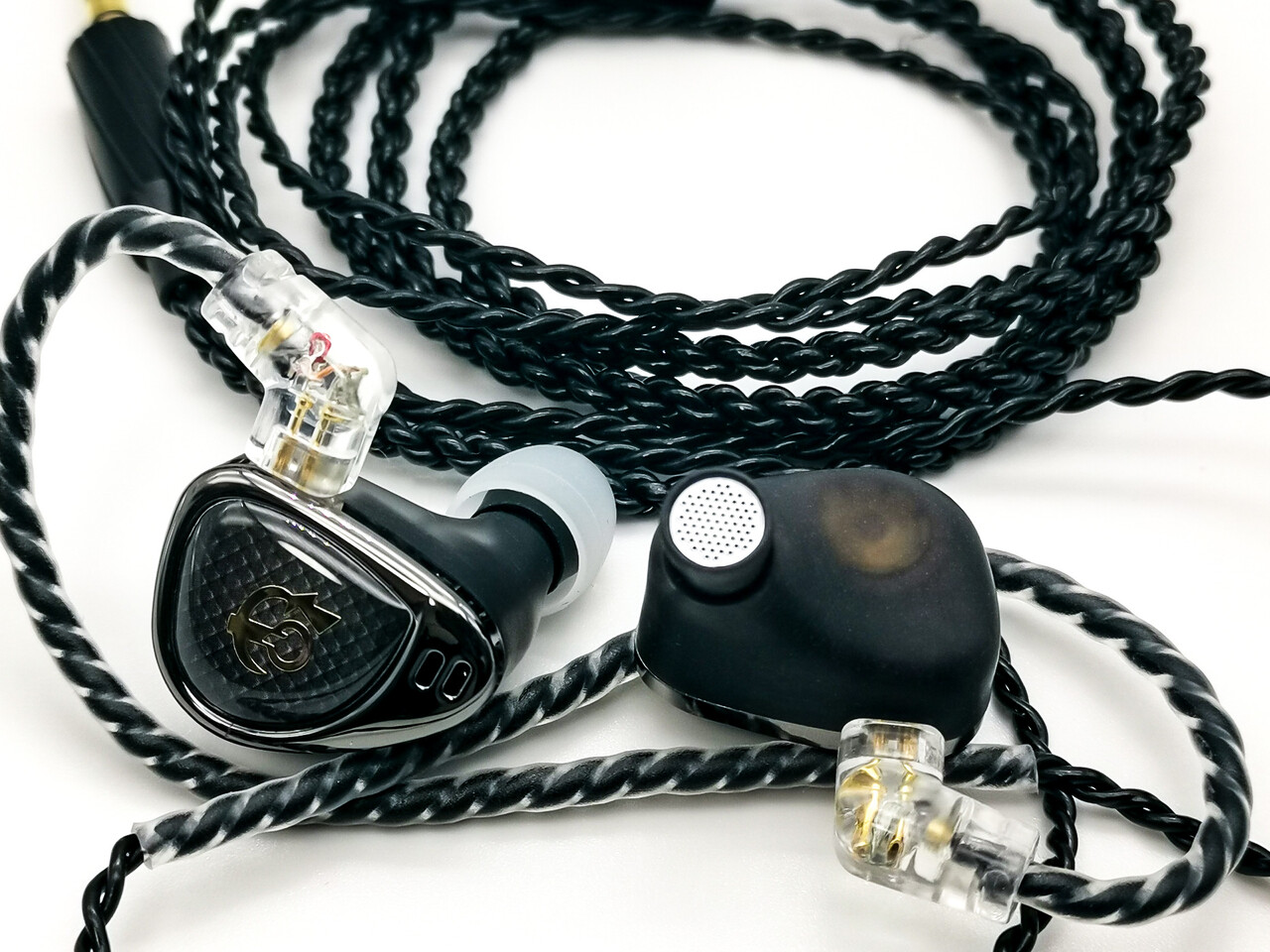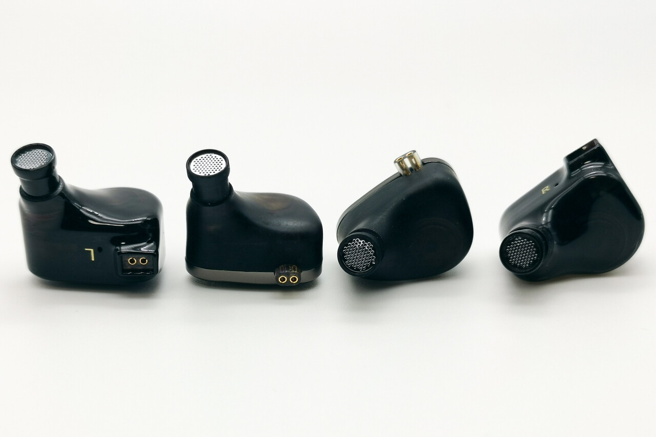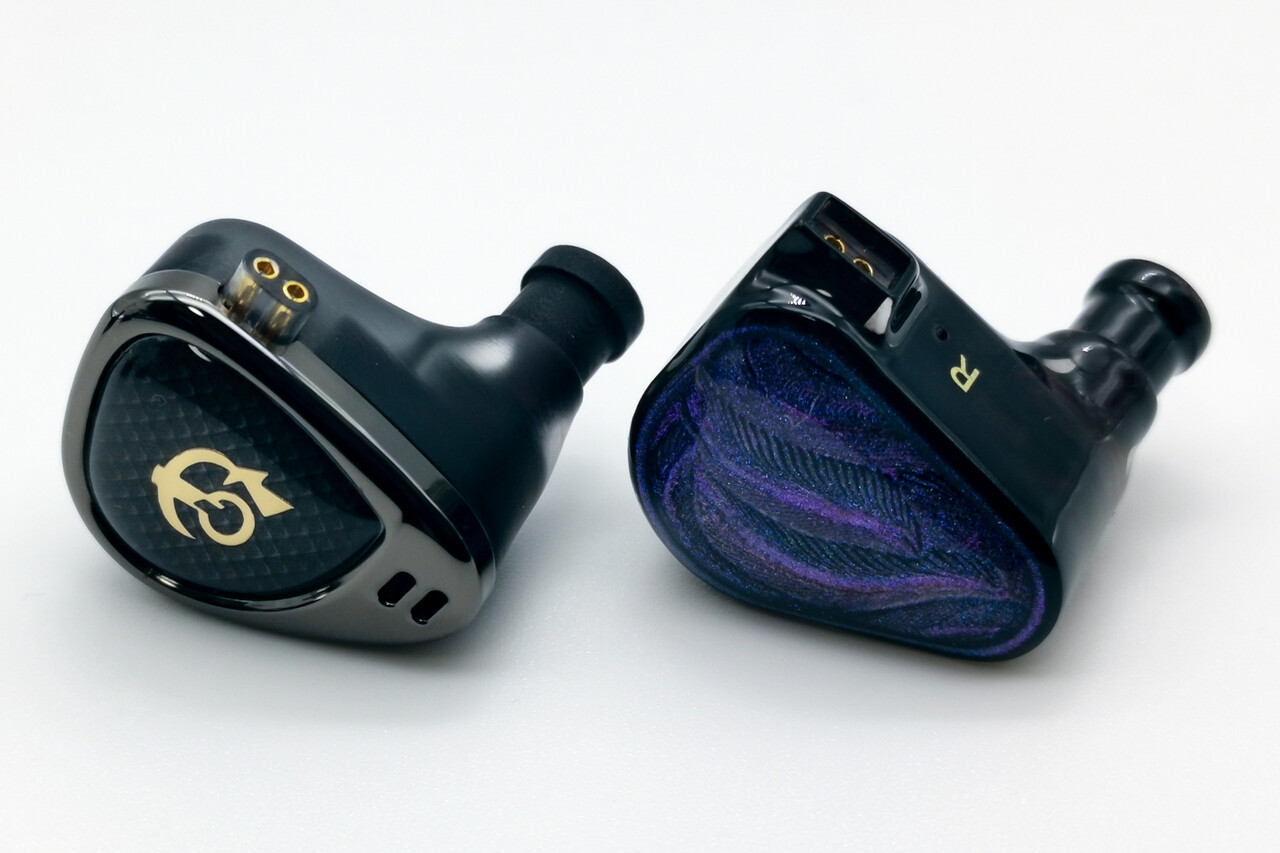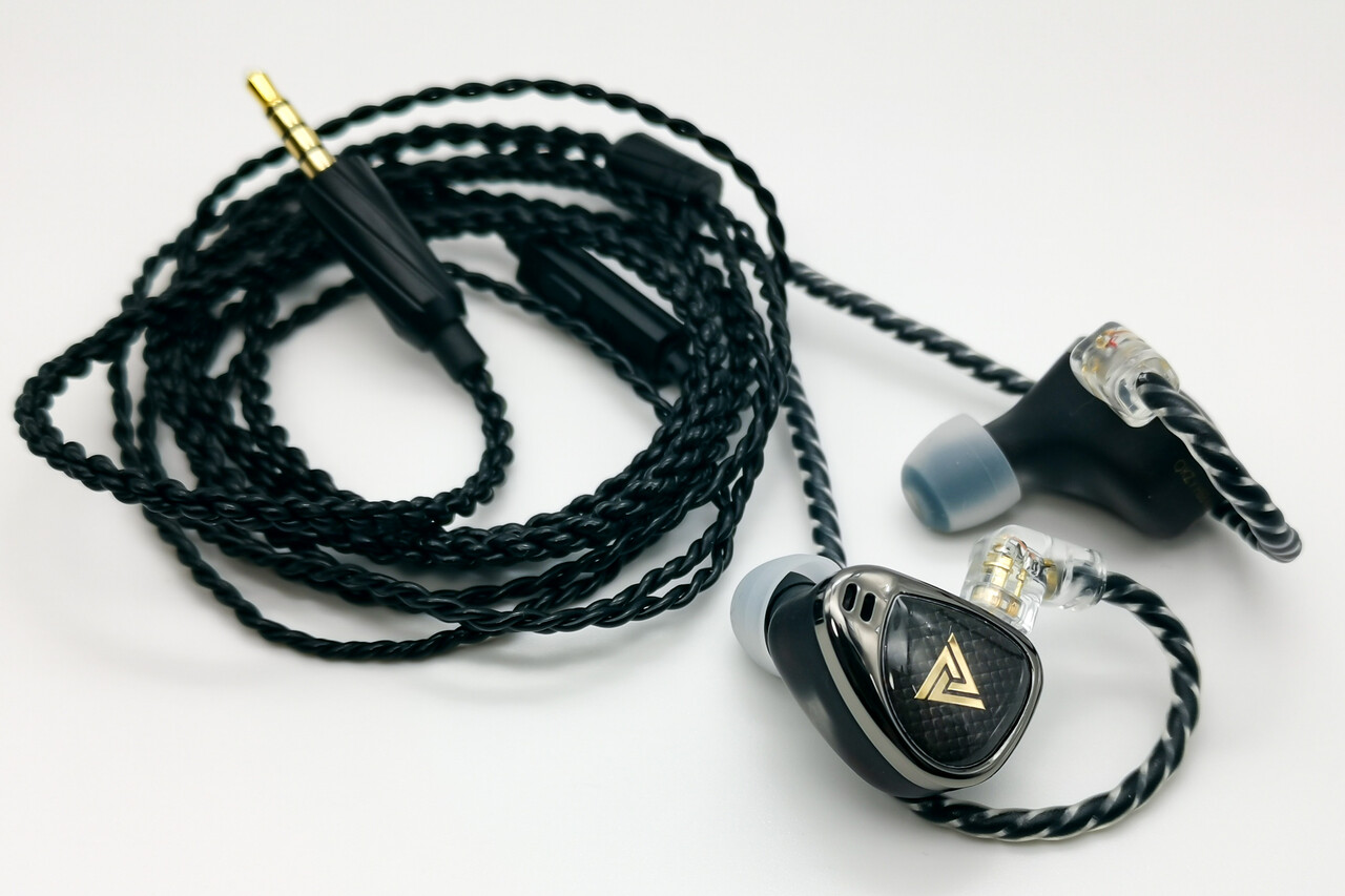 2基のダイナミックドライバーを並列に配置する本体はやや上下に長めのフェイスデザインでステムノズルが長めに張り出しています。DLP-3Dプリンティングされたハウジング部分はドライバーがかすかに透けて見えるつや消しの樹脂製。シェル部分の形状や質感は500ドルを超える「Moondrop Variations」をちょっとだけ彷彿とさせるものです。それだけシェルの作りは良く一見すると低価格イヤホンには見えない印象です。