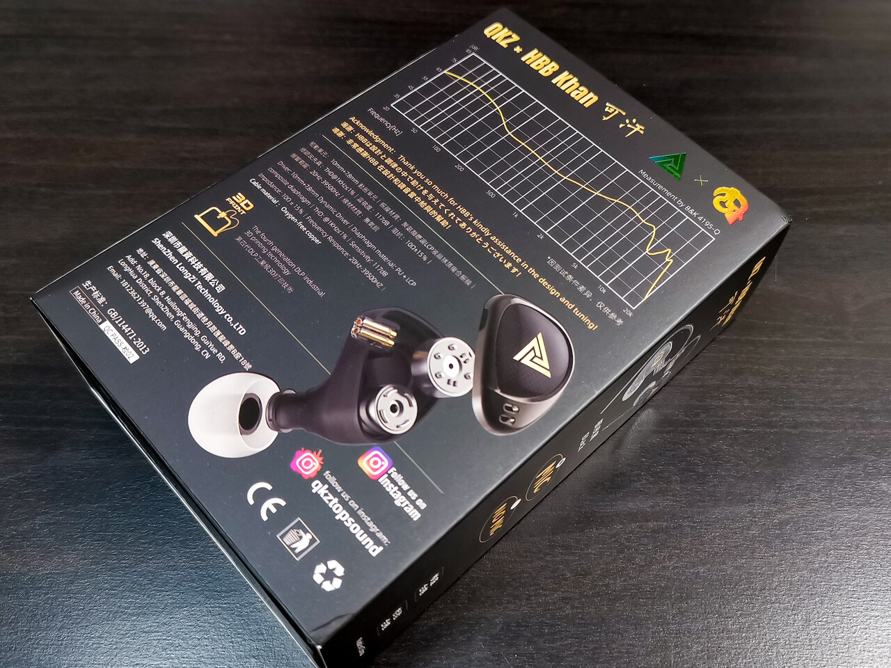 「QKZ x HBB Khan」のパッケージはいつものKZ風のコンパクトな箱ではなく、結構しっかりしたボックスで届きました。相変わらず隙間を文字やロゴで埋めないと気が済まないのかなという感じのパッケージデザインで、怪しさが全開なのは相変わらずですが・・・