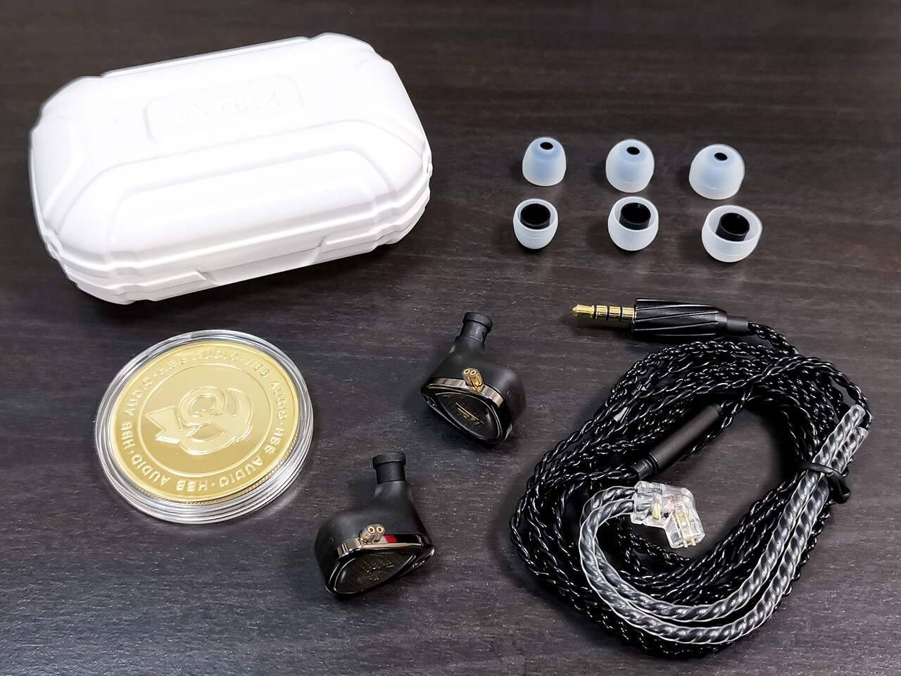 パッケージ内容は、イヤホン本体、ケーブル、イヤーピース(S/M/Lサイズ)、ゴールドからのメダルとメダルケース、プラスチック製のイヤホンケース。メダルはまあまあ巨大ですが、この手のオマケの有り難みが相変わらず分からない私であります。