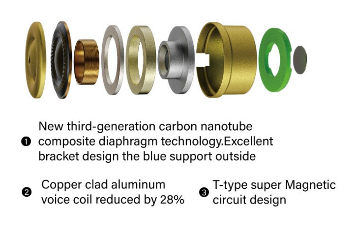 「TINHIFI T4 PLUS」では第3世代のカーボンナノチューブ(CNT)複合振動板ダイナミックドライバーをシングルで搭載。新しいCNT振動板は従来より軽量化され物理的特性を大幅に改善。 鋼の400倍もの強度を持つCNTとさらにPU素材を複合した構造を採用することで、よりクリアなサウンドを実現しています。さらに N54 磁気回路設計とCCAW 多層ボイスコイルの採用により原音忠実性の高い表現力を備えました。