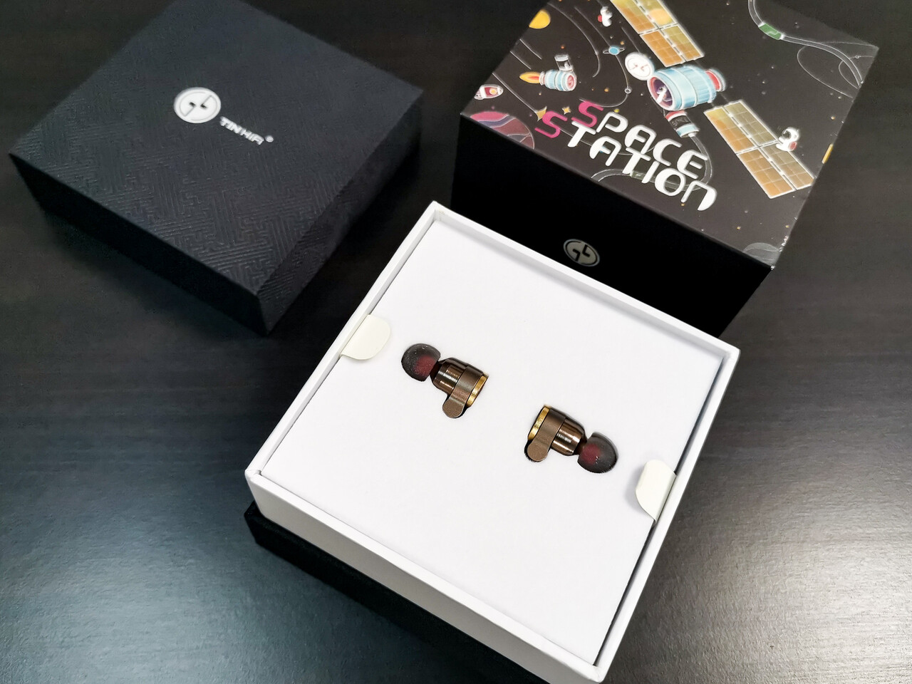 本体はアルミ合金製でシェル形状は「T2 DLC」を踏襲しつつブロンズカラーで仕上げられています。また「TINHIFI T4 PLUS」の特徴的なデザインとして、フェイス部分がゴールドカラーの金属製リムで囲まれた木製プレートが埋め込まれています。