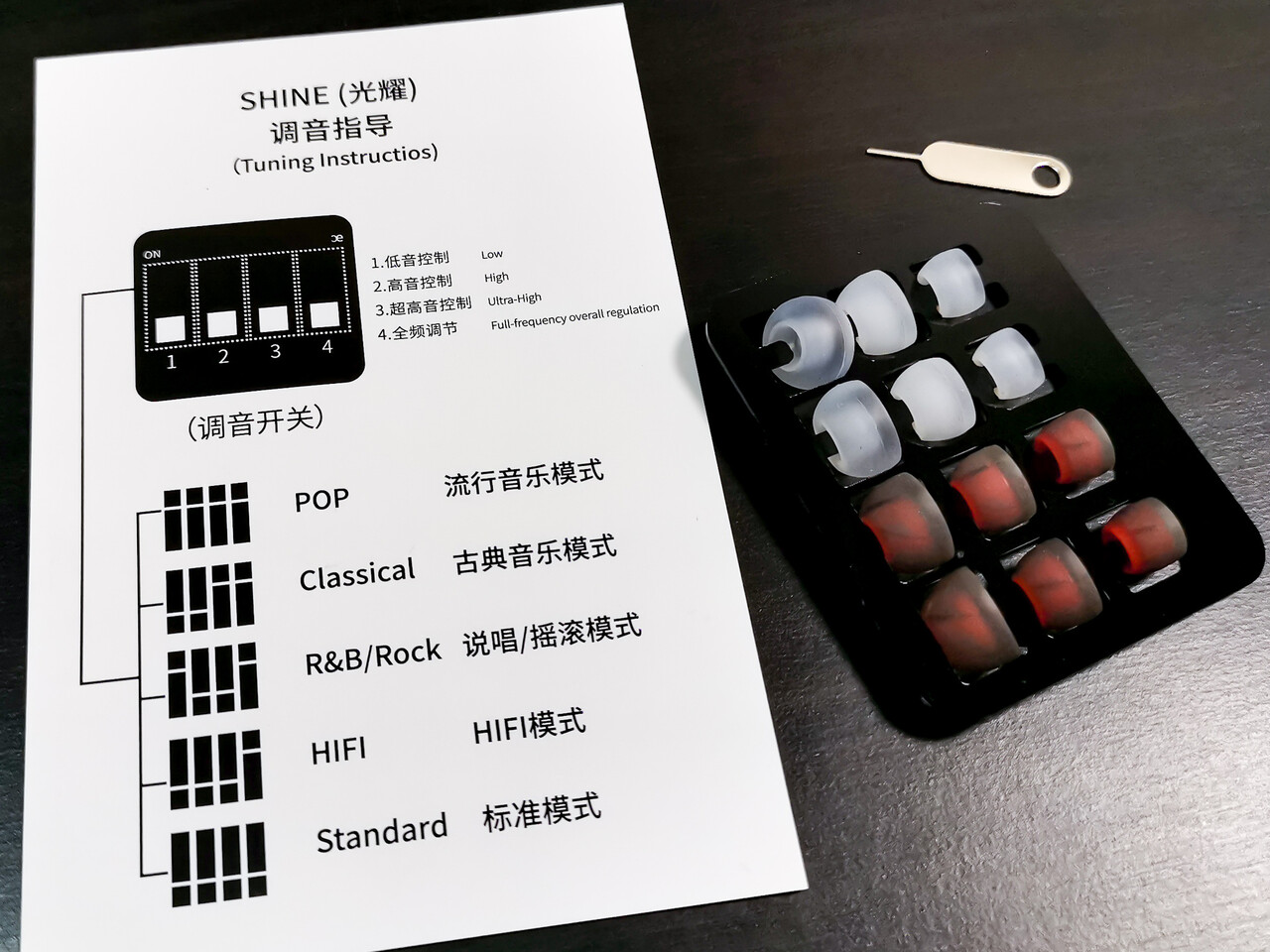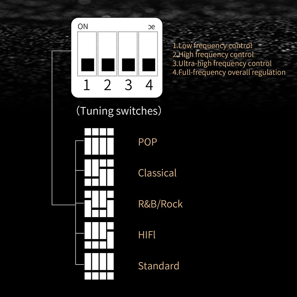 「Joyodio SHINE」の側面スイッチは①低域(Low)、②高域(High)、③超高域(Ultra-High)、そして④全体の調整(full frequency overall regulation)という記載になっています。①②③の各スイッチでも各音域のネットワーク的な抵抗値が変わる仕様と考えられ、インピーダンスや感度などに多少影響するはずですが、なかでも④についてはインピーダンスそのものを一気に変更するスイッチだと思われます。「Joyodio SHINE」の仕様ではインピーダンスは「11Ω~31Ω」と記載されており、④のスイッチだけでON/OFFの差が確実に10Ω以上は変化しそうですね。そのため、「HIFI(0001)」では「Standard(0000)」に比べ分かりやすく音量が変化します。またニュートラルな傾向維持したまま暖色方向から一気に寒色な印象に変化し明瞭感とキレの良さが一気に向上します。そして、「R&B/Rock(1001)」はメリハリを高め低域のパワーを増すチューニング、「Classical(0011)」は「HIFI(0000)」をベースに超高域を伸ばすことで聴きやすさより透明感を増したチューニング、というように解釈することが出来ます。