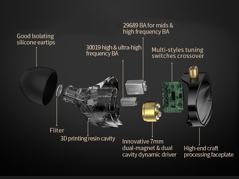 ドライバー構成は高域および超高域用ツィーターの「30019」BAと、中音域から中高域をカバーするフルレンジの「29689」BA、そして低域用の「7mm 二重磁気デュアルキャビティダイナミックドライバー」を搭載します。ちなみに「30019」および「29689」はどちらもKnowlesの「WBFK」および「ED」シリーズで同型番のBAユニットがありますが、KZやTRNと同様にBellsingなど中華BAサプライヤーからの相当品と考える方が妥当でしょう。ポイントなのは独自のクロスオーバー処理を行うネットワーク回路でこのイヤホンの最も重要な部品といえるでしょう。従来の数々の低価格中華イヤホンで成熟し、しかも低コストで入手可能となった各ドライバーを使用しつつ、特許技術のネットワーク回路を使用することで、1ランク製品のステージを上げたような音作りを実現しているようです。