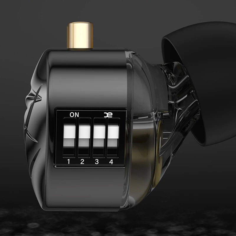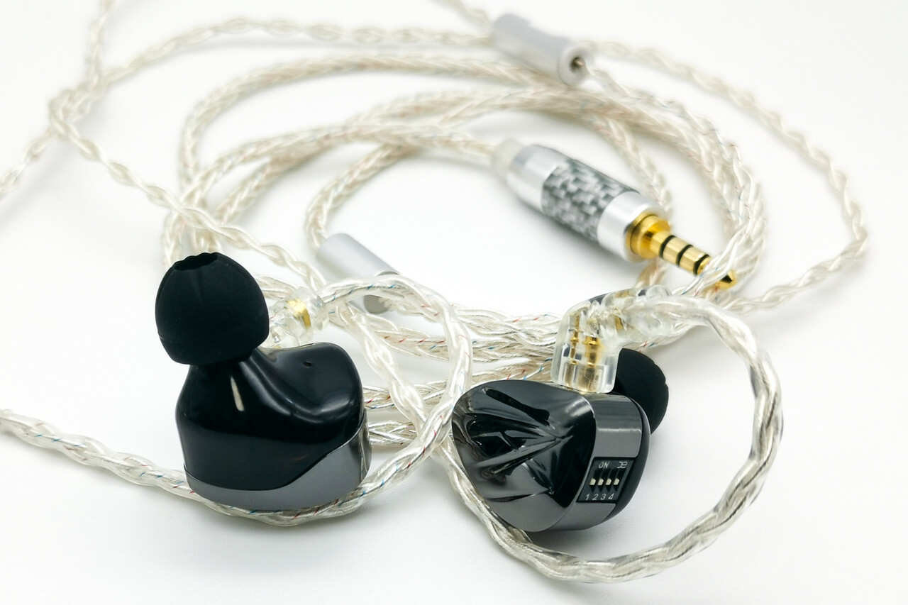 中音域は比較的近くボーカルは前向きに感じます。④スイッチのOFF/ONで暖色系・寒色系に変化し、OFFではやや暗く、ONでは鮮やかさのある印象になります。分離は良く音場は適度な広さと奥行きがあり演奏とボーカルの音像も比較的捉えやすいですが、定位はモードによって多少変化します。低域はスッキリしたスピード感のある音を鳴らします。7mmドライバーは十分に深さのある重低音を持ちつつ、スピード感のある音を鳴らします。KZのようなパワー押しな感じはないものの量感は十分で締まりのあるミッドベースと併せてにじみの少ない聴きやすい音だと思います。