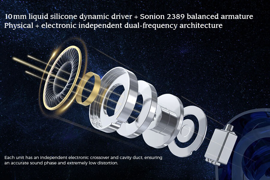 「LETSHUOER x GIZAUDIO Galileo」ではドライバーに「10mmサイズのリキッドシリコン振動板&アルミニウム・マグネシウム(Al-Mg)合金ダイナミックドライバー」および Sonion製のフルレンジ使用のバランスド・アーマチュア(BA)ドライバー「Sonion 2389」を搭載。さらに各ドライバーユニットごとに独立した電子制御によりクロスオーバーを調整しています。