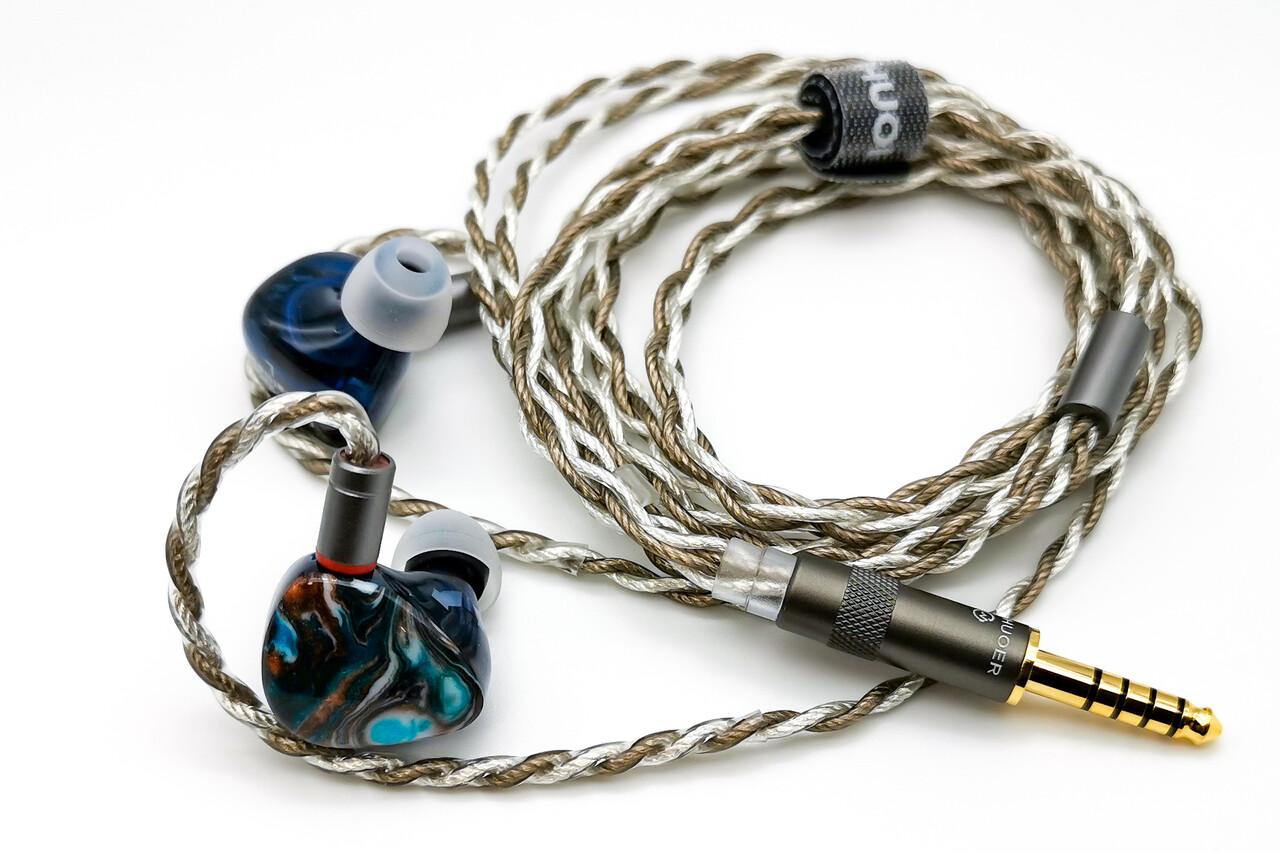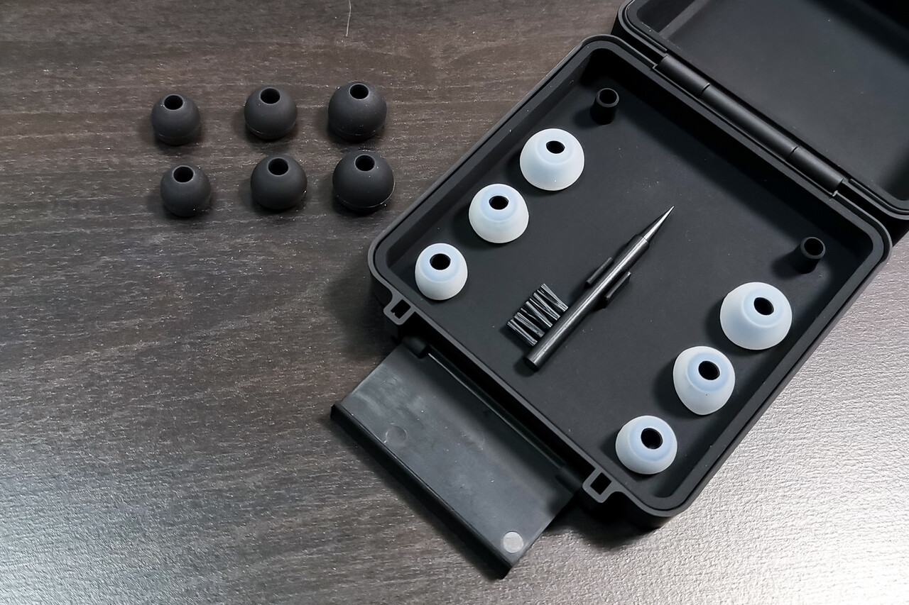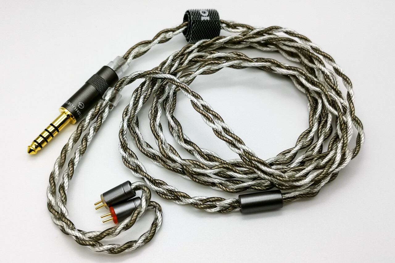 ケーブルは銀メッキOFC(高純度無酸素銅)の撚り線で2色の線材が渋い印象です。「S12」の付属ケーブルとほぼ同じですね。今回は4.4mmでオーダーしました。イヤーピースは柔らかく開口部が小さい黒色タイプと開口部が広い白色タイプの2種類。付属品のほか、定番のJVC「スパイラルドット」や、よりフィット感の強いタイプでは「SpinFit CP100+」など、自分の耳に合う最適なイヤピースを選択するのも良いでしょう。私は前述のような理由で「Softears U.C.」を選択しました。他にも同様のケースでは「DUNU S&S」なども良いと思います。