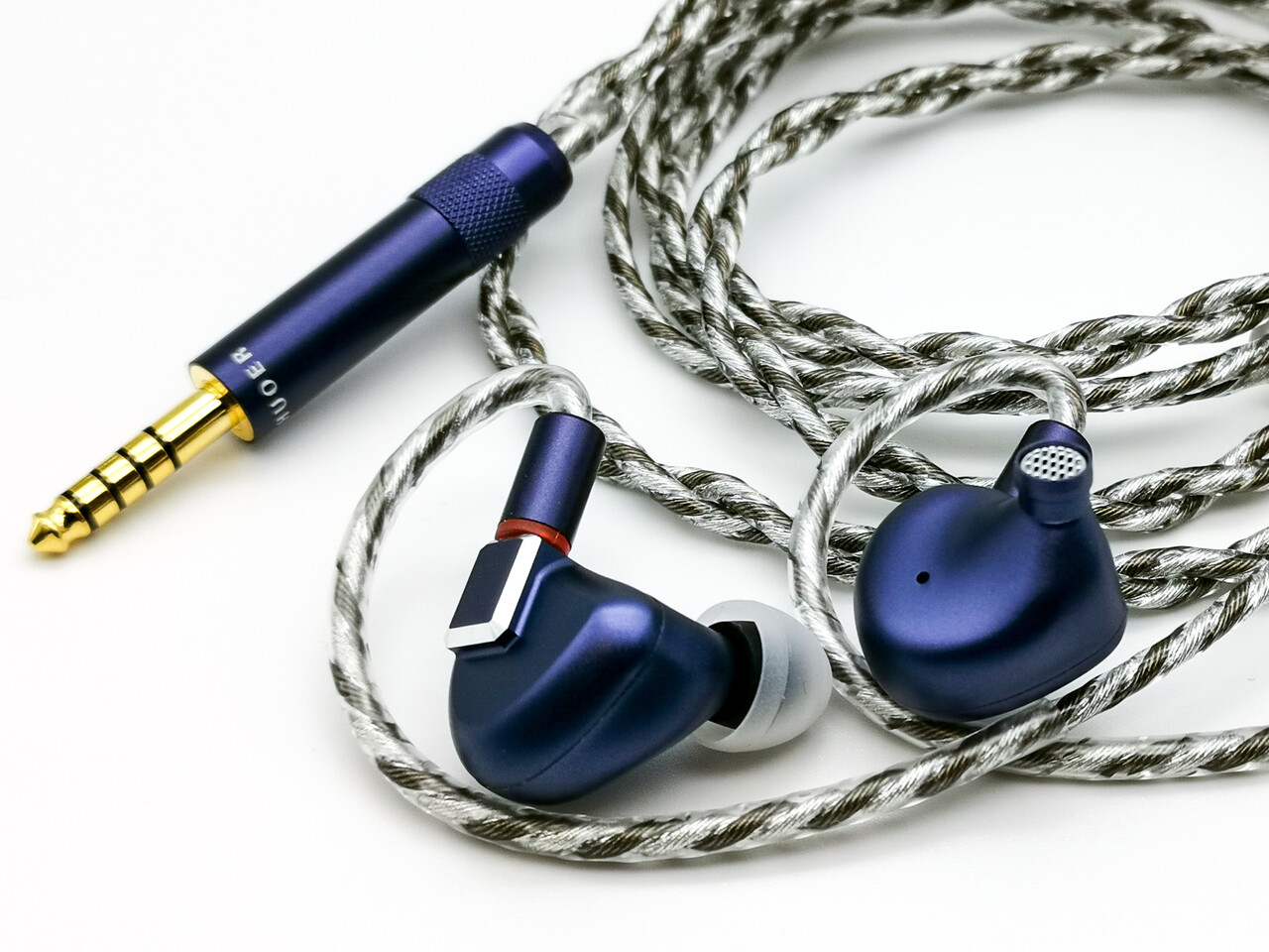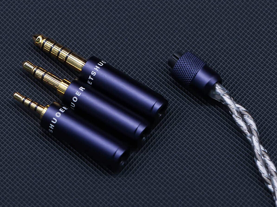 そして、「LETSHUOER S12 Pro」では付属ケーブルをアップグレード。交換可能なモジュラー式のプラグを採用した高純度銀メッキ単結晶銅ケーブルが付属します。線径0.05mmの線材を98本束ねた芯を左右2本ずつ樹脂被膜で覆い撚り線にした4芯タイプのケーブルで、本体への接続は標準的な0.78mm 2pinコネクタを採用します。パッケージには3.5mm、2.5mm、4.4mmの各プラグが同梱されます。