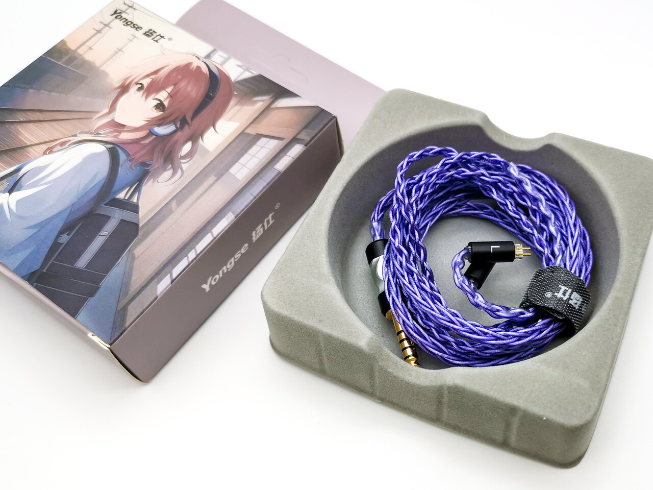 「Yongse Rainbow Plus」のパッケージはキャラ絵の描かれたボックス。30ドル程度の低価格ケーブルですがしっかりパッケージが用意されているのは逆に珍しいかもしれませんね。今回はパープルカラーのケーブルが届きました。ちなみにサイトにはパープルとかバイオレットとかラベンダーとか色々書かれていますが同じケーブルです。