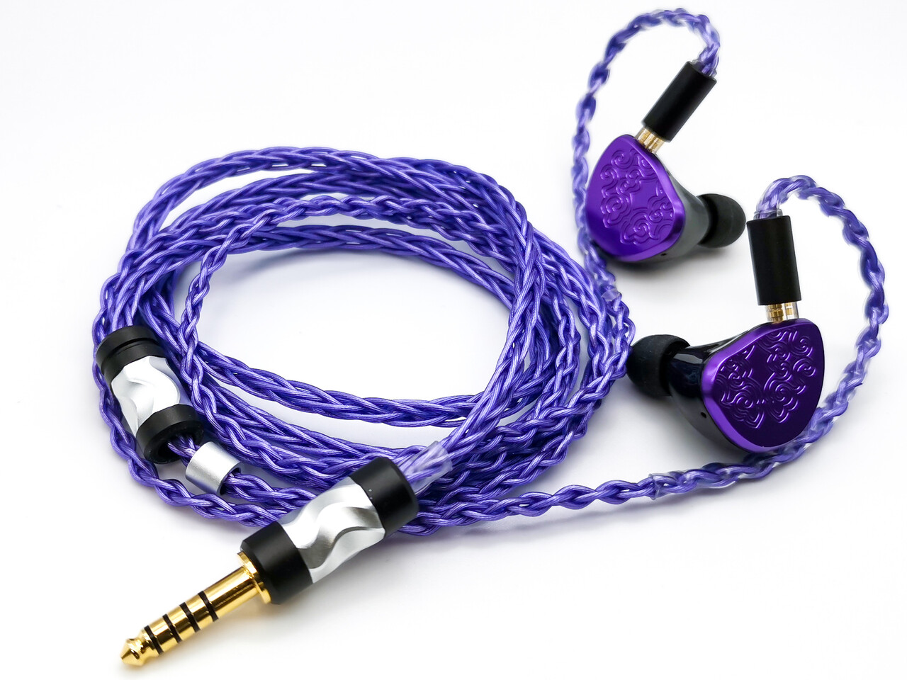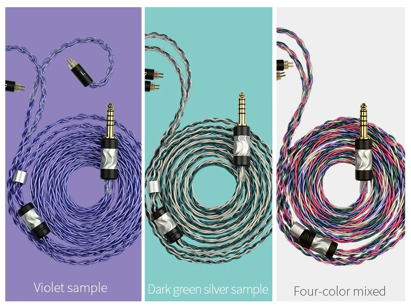 「パープル」「グリーン&シルバー」「レインボー」の3色のカラーバリエーションが選択でき、MMCXおよびCIEM 2pinタイプのコネクタが用意されます。プラグも3.5mmのほか、2.5mmおよび4.4mmのバランス接続も選択可能です。