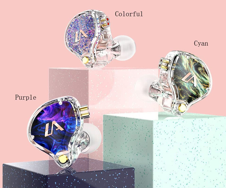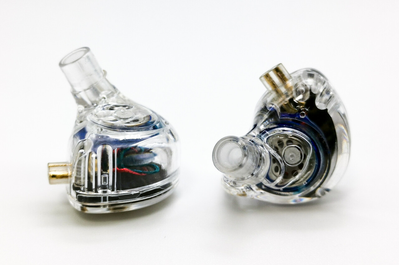 シェルは透明なプラスチック製。ドイツから輸入した樹脂を使用しているとのことで、透明度の高い透明さが特徴です。形状はKZやTFZに近い一般的なデザイン。まあこの辺は低価格イヤホンならではですね。カラーは紫で届きましたが、届いた個体のパネルはほぼ黒色に近いものでした。雲母パターンは個体によって模様な色味が違うので、こういうパターンもありますね。