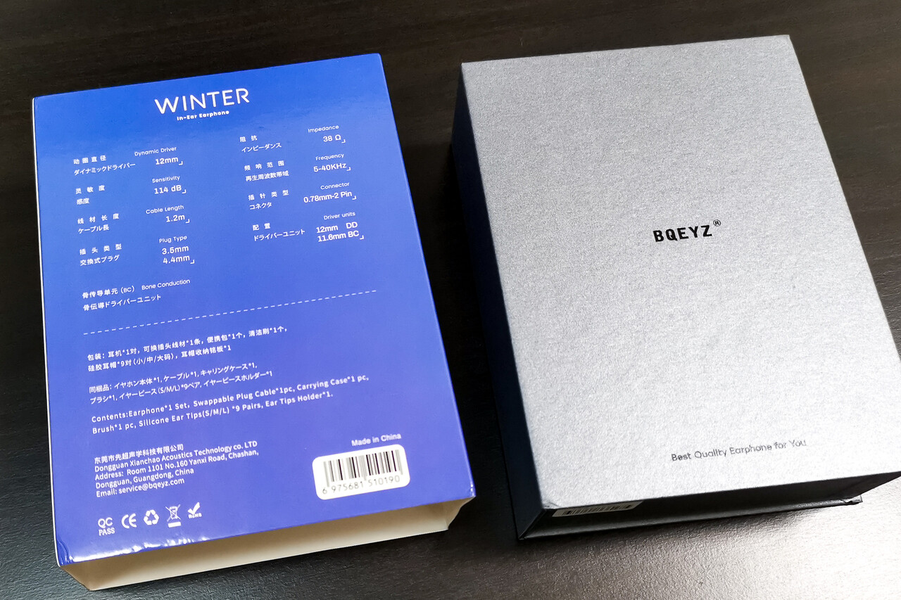 「BQEYZ Winter」のパッケージは本体カラーに合わせたブルーを基調とした化粧カバーに覆われたデザインです。背面の仕様を見ると(届いた時点では製品の詳細はまだ未発表でした)、インピーダンス 38Ω、感度 113dB、周波数応答 5Hz~40KHzと諸元はオリジナルと「Winter」と同じであることが分かります。