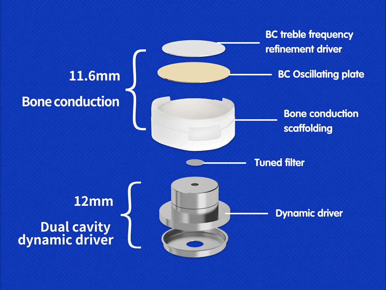今回の「BQEYZ × Angelears Winter Ultra」はベースとなった「BQEYZ Winter」同様に、「12mm PAR振動板・デュアルキャビティ・ダイナミックドライバー」と「11.6mm PZT(ピエゾセラミック/圧電)骨伝導ユニット」で構成されています。オーディオグレードの骨伝導ドライバーを搭載するイヤホンというと「Unique Melody」や「Empire Ears」の高級IEM製品に限定されることが多く「BQEYZ Winter」は現在でもかなり特殊な存在と言えるでしょう。