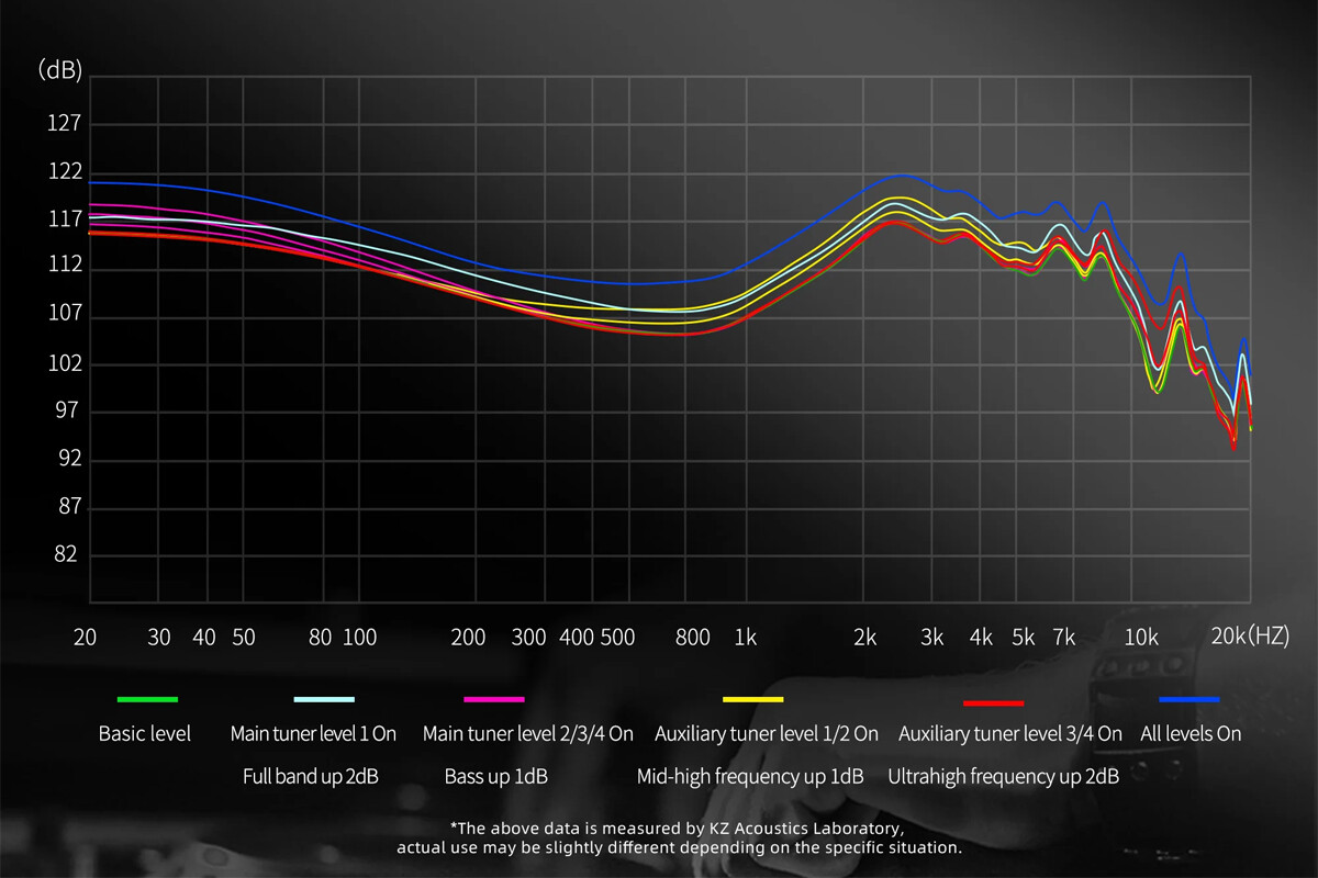 そして「KZ AS24」では新たにスイッチ付きモデルを設定。メインチューナー用の4つのスイッチと、補助(Auxiliary)スイッチとして4つ、合計2系統8個のスイッチを搭載します。メインスイッチはスイッチ1が全体の出力を2dBアップし、スイッチ1の2・3・4をONにすると低域が1dBアップします。補助スイッチは1と2をONで中高域を1dBアップ、3と4をONで高高域を2dBアップします。そして8個すべてをONにすることで、全体の感度がアップします。