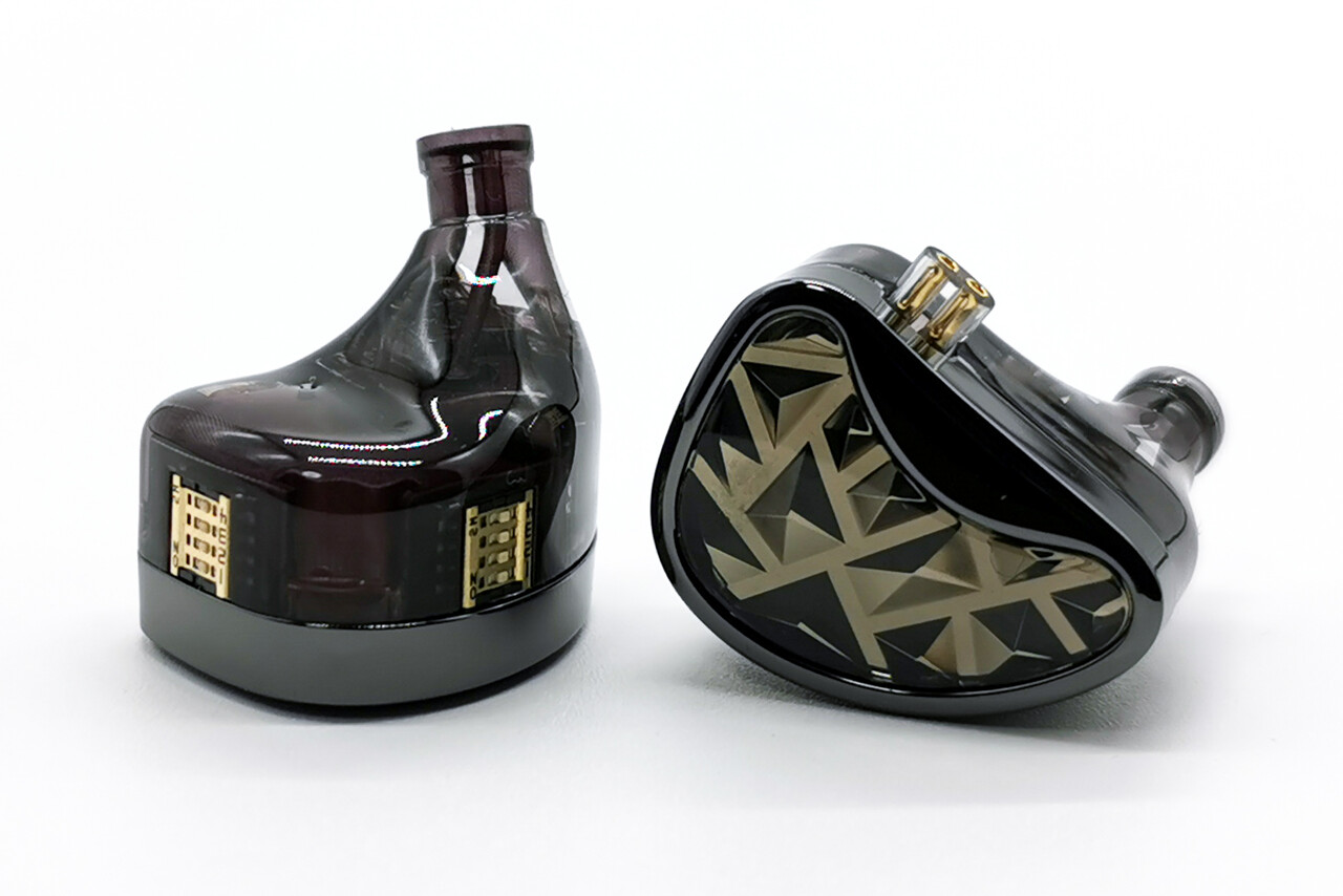 本体形状は以前の「KZ AS16」などのシリーズを踏襲しており、フェイスプレートは金属製で凹凸のあるデザインが施されたフェイス部分に透明な樹脂パーツが貼り付けられています。上位モデルらしくちょっとだけ凝った意匠ですね。本体部分は従来の金型成形のプラスチックではなく、3Dプリンタ出力によるもので内部に音導管を出力し、各BAユニットが接続されています。