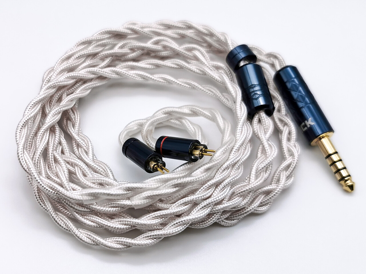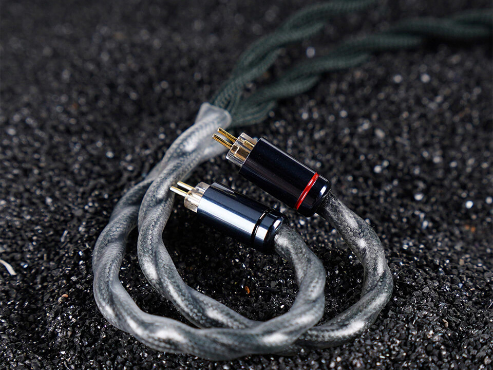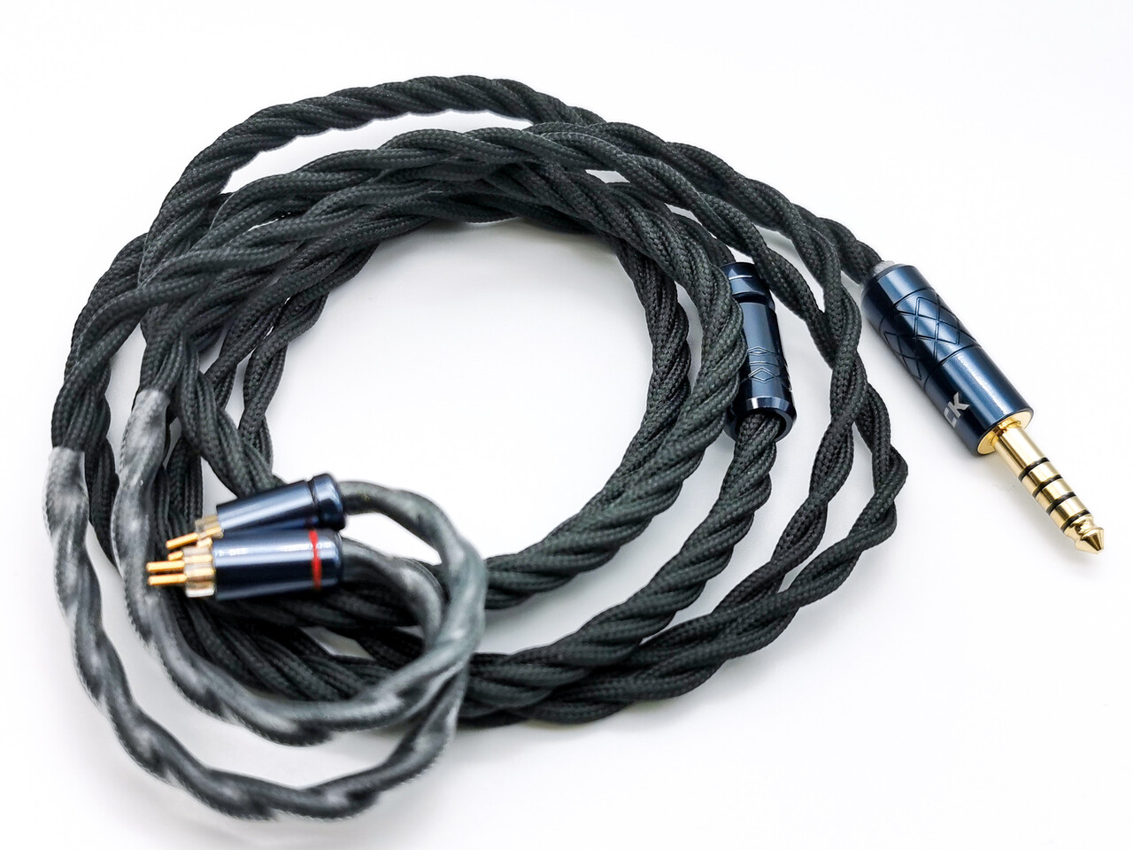 ほぼブラックに近い深いグリーンの布被膜で覆われた太めの銀メッキ線ケーブルです。プラグやコネクタ部分は上位ケーブルと同様の濃いダークブルーの金属製パーツを使用しています。プラグは3.5mmのほか、4.4mm、2.5mmを、コネクタはCIEM 2pinとMMCXが選択できます。