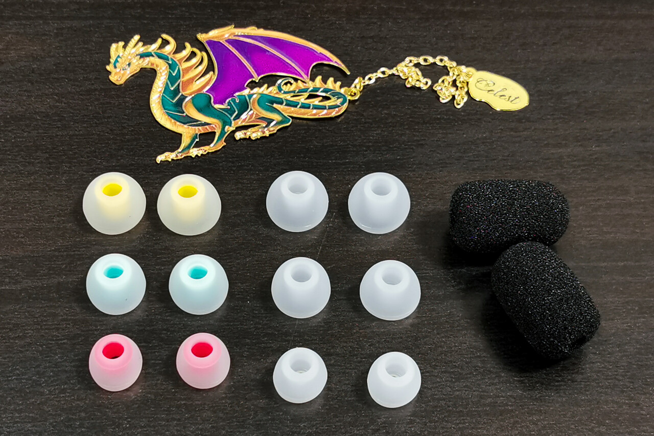 パッケージ内容は、イヤホン本体およびケーブル、Proモデルでは脱着式ヘッドセットマイクとマイク用のスポンジカバー、イヤーピースは2種類、それぞれS/M/Lサイズ、説明書と、「Celest」シリーズではお馴染み製品名称のイメージデザインのメタルアクセサリー。
