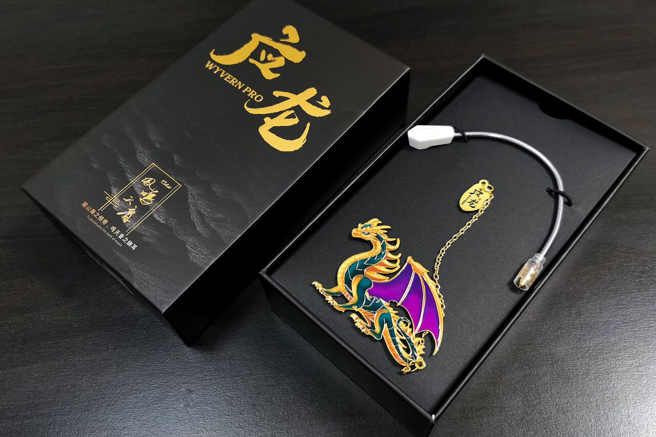 今回の「Kinera Celest Wyvern Pro / Wyvern」はその名称のとおり、「Wyvern(ワイバーン)」をモチーフににしています。ワイバーンはRPGなどで出てくる飛龍(中国語読みだと「Feilong」)として多くの方に馴染みのある存在ですが、中国の古代神話では「黄龍(Huanglong)」とも呼ばれ、翼と4本の爪を持ち、火を吐き、風と雨を吐き、空や地下を飛ぶとき、それは雷と稲妻を引き起こします。 天と地の間の風と雨を司る存在とされています。そして多くのゲームやファンタジーの題材で登場するように神話の中でも様々な場面で登場しています。このイメージを受け継ぐ「Kinera Celest Wyvern Pro / Wyvern」は、10mm LCP(液晶ポリマー)振動板ダイナミックドライバーをシングルで搭載しており、音楽リスニング用途以外にも、映像、ゲーム、ミーティング、ライブ配信などの「多用途向け」イヤホンとしてリリースされました。そのためケーブルはマイク付きのみで、通常のイヤホンマイク仕様の「Celest Wyvern」と、ヘッドセットマイクケーブルが付属する「Celest Wyvern Pro」の2製品を展開しています。