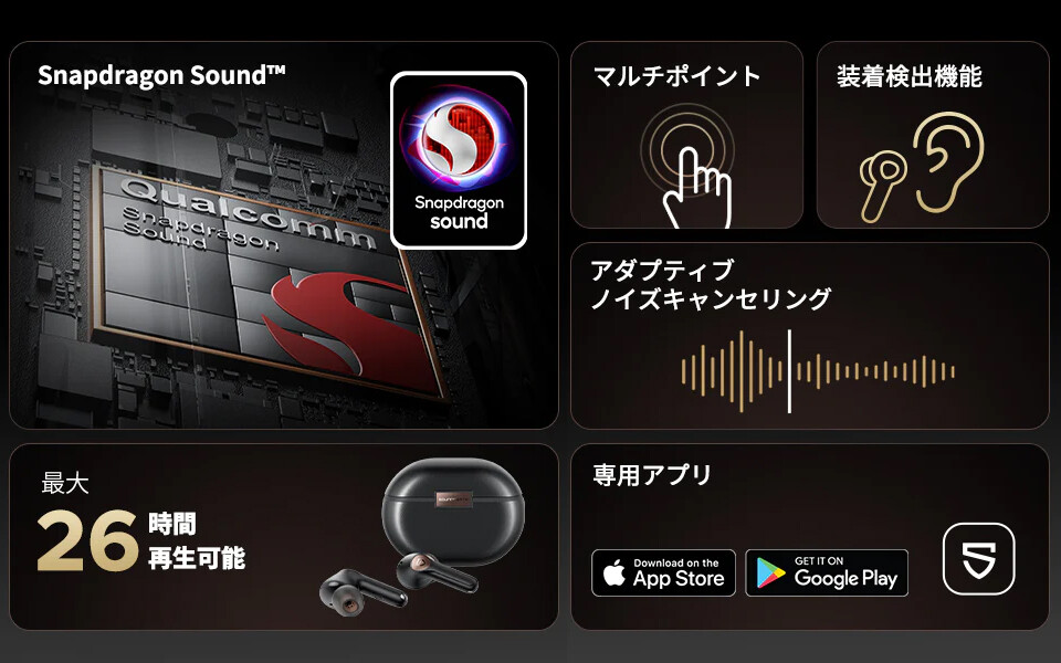 ほかにも、「SOUNDPEATS Air4 Pro」は「装着検知機能」「マルチポイント対応」「本体6.5時間、ケース込み26時間の長時間再生」「IPX4の防水性能」「低遅延のゲームモード」「アプリ対応」など文字通り「全部入り」仕様となっています。