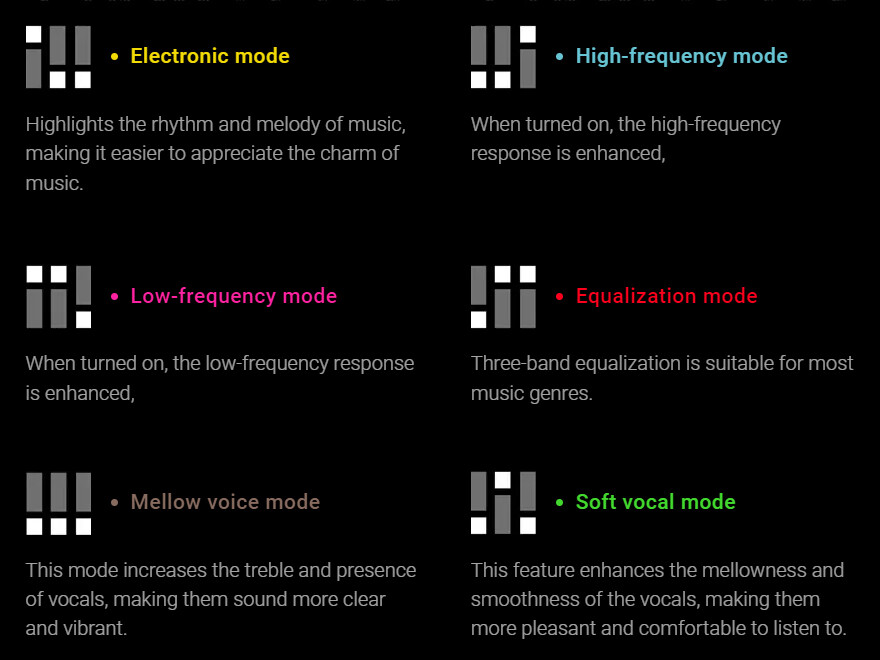 シェル本体は軽量な金属シェルを採用し、さらに3系統のスイッチコントロールを搭載。6種類のサウンドモードを切り替えることができます。標準では「バランス型」(Equalization mode)に設定されており、さらに「電子音楽向け」(Electronic mode)、「高域強調」(High-frequency mode)、「低域強調」(Low-frequency mode)、「ボーカル強調」(Mellow voice mode)、「ソフトボーカル」(Soft vocal mode)の各モードに設定変更が可能です。