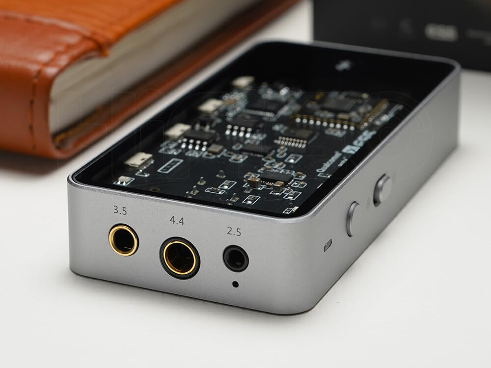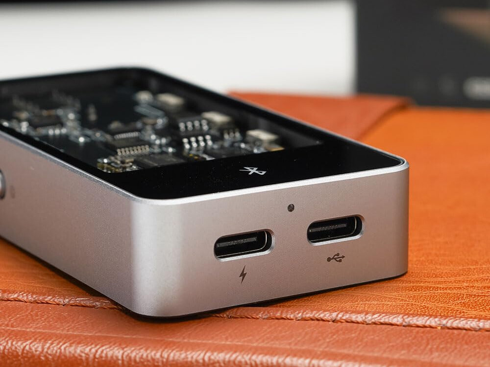 本体は金属製でブラックの表面および裏面はガラスパネルで覆われています。特徴的なのはガラスパネル越しに見えるメイン基板で、DACチップ、アンプなど各チップが確認出来るようになっています。このように基板を見せる演出は最近の小型オーディオアダプターで増えてきており、ちょっと流行ってるぽいですね(^^;)。