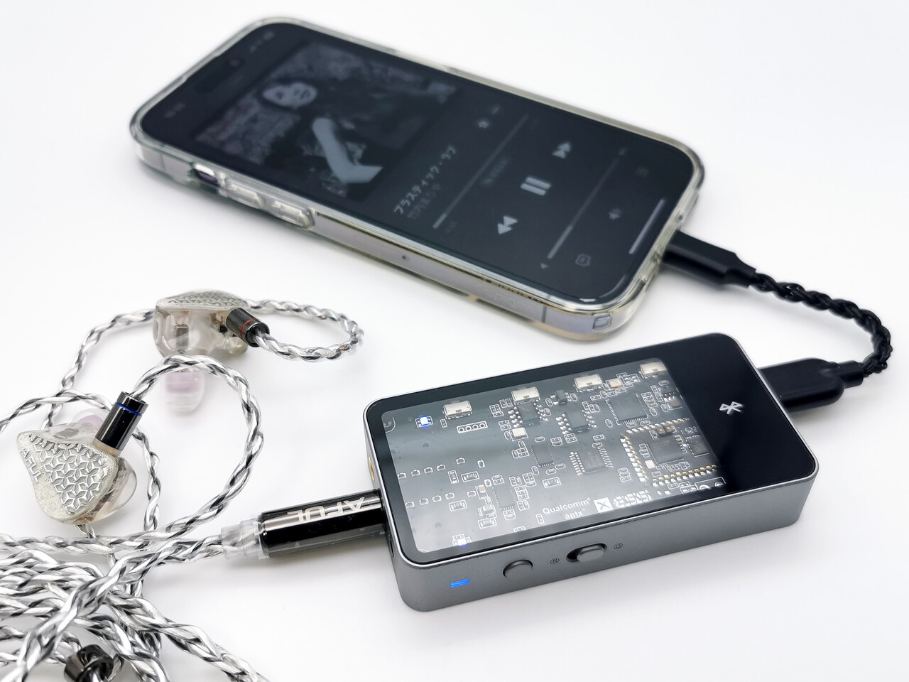 サイズは41.8×84×15mm、重量73gと、この手の製品の人気モデルの「FiiO BTR7」あたりと比べると少し大きいですがLDACおよびapyX Adaptive対応に加えDACにES9038Q2Mを搭載しているモデルとしては十分にコンパクトにまとまっている印象です。2万円ほどのワイヤレス製品ですが普通に据置きUSB-DACとしても使えそうな性能ですね。